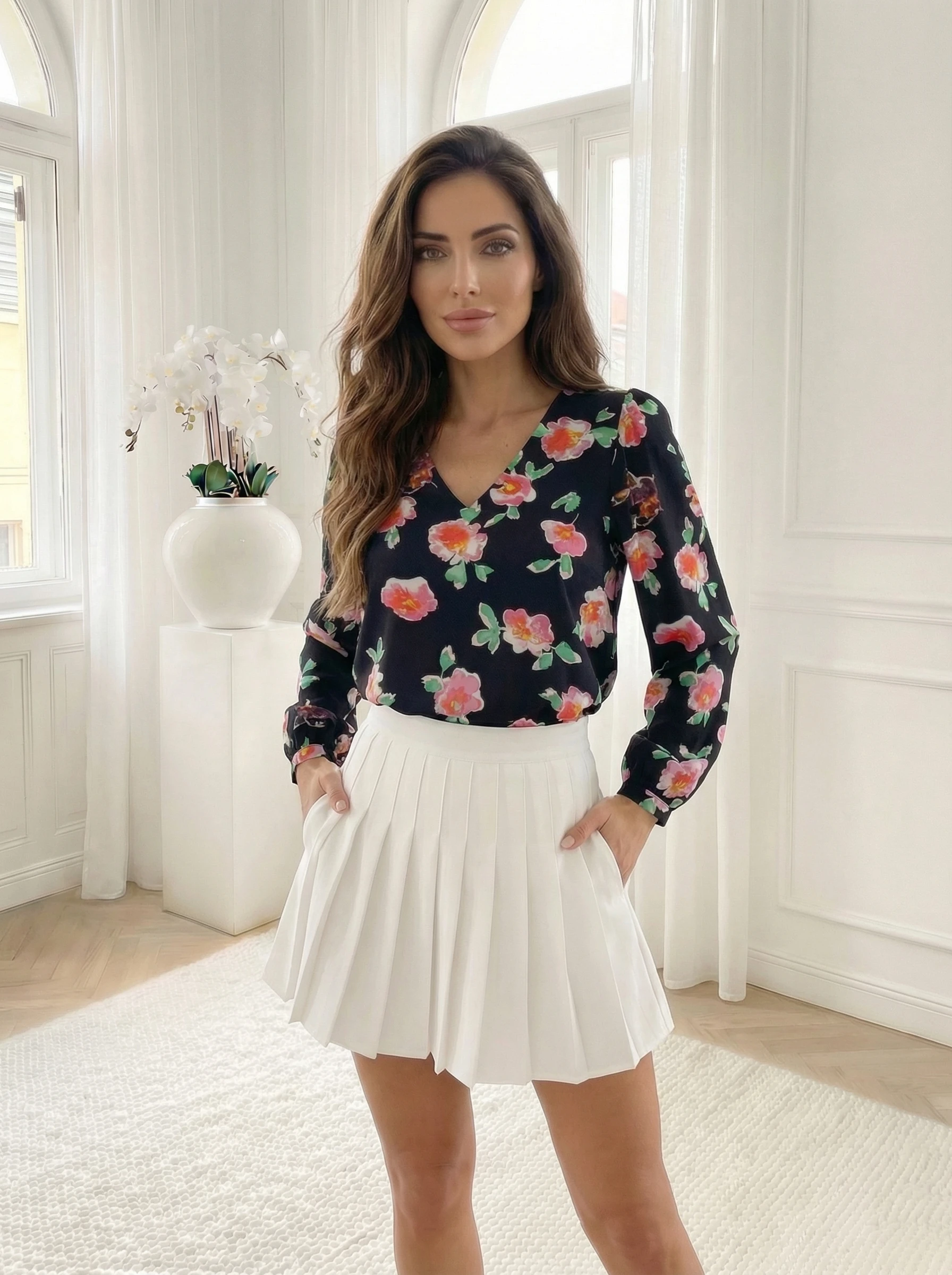 Bluză elegantă cu decolteu în v și imprimeu floral trandafiriu impresionează prin imprimeul floral vibrant pe fundal negru și croiala feminină cu decolteu în V. Este o piesă versatilă și sofisticată, perfectă pentru a fi purtată cu pantaloni office negri pentru un look profesional complet.