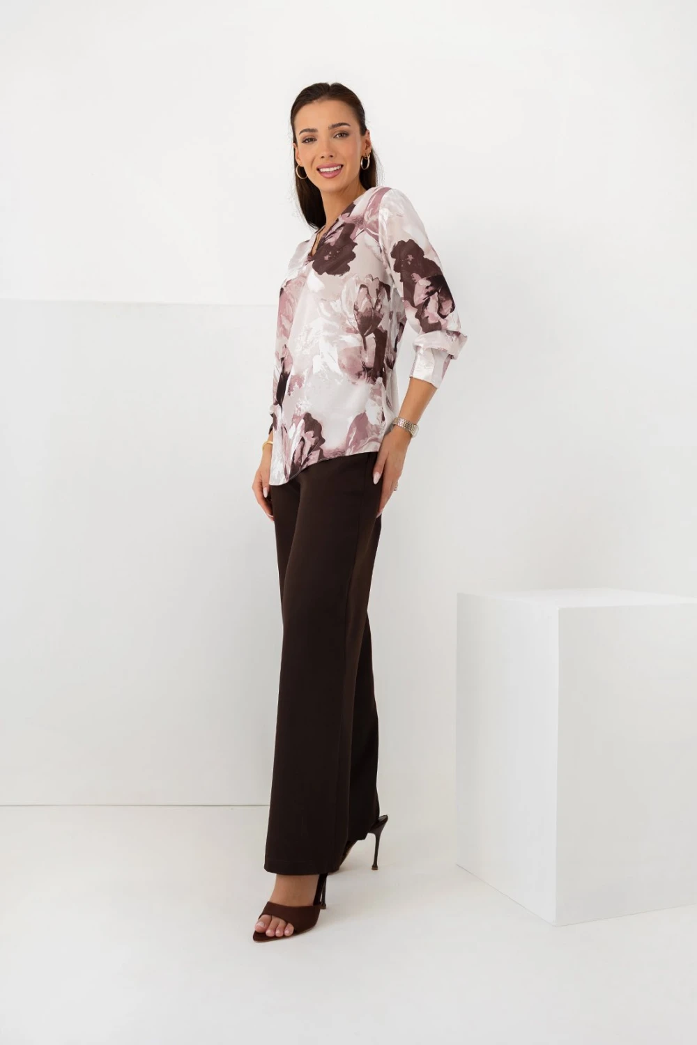 Bluza eleganta din vascoza cu imprimeu floral abstract si decolteu in V, o piesă vestimentară rafinată, perfectă pentru o ținută de birou sau o ieșire casual. Cu un imprimeu floral subtil, în nuanțe calde de maro, roz și alb murdar, bluză este ideală pentru a crea un look elegant și confortabil în orice sezon.