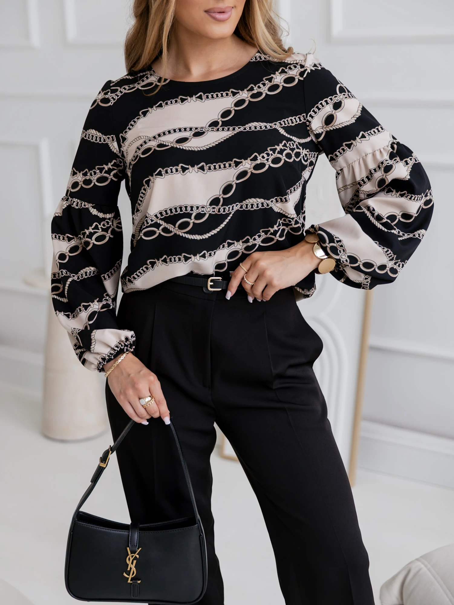 Bluza eleganta neagra cu imprimeu lanturi si maneci bufante, o piesa moderna si sofisticata, perfecta pentru femeile care apreciaza un look rafinat si versatil. Realizata din material placut la atingere, ofera confort pe parcursul intregii zile si un aspect stylish, potrivit atat pentru tinute office, cat si pentru ocazii casual chic.