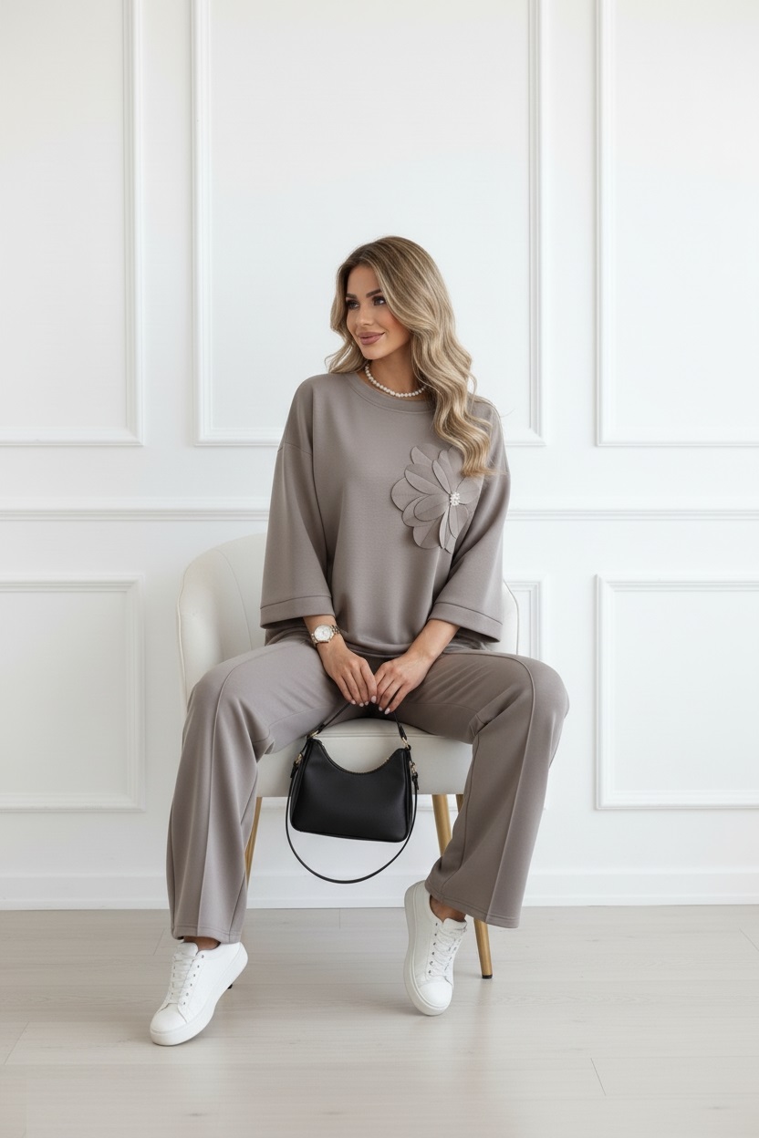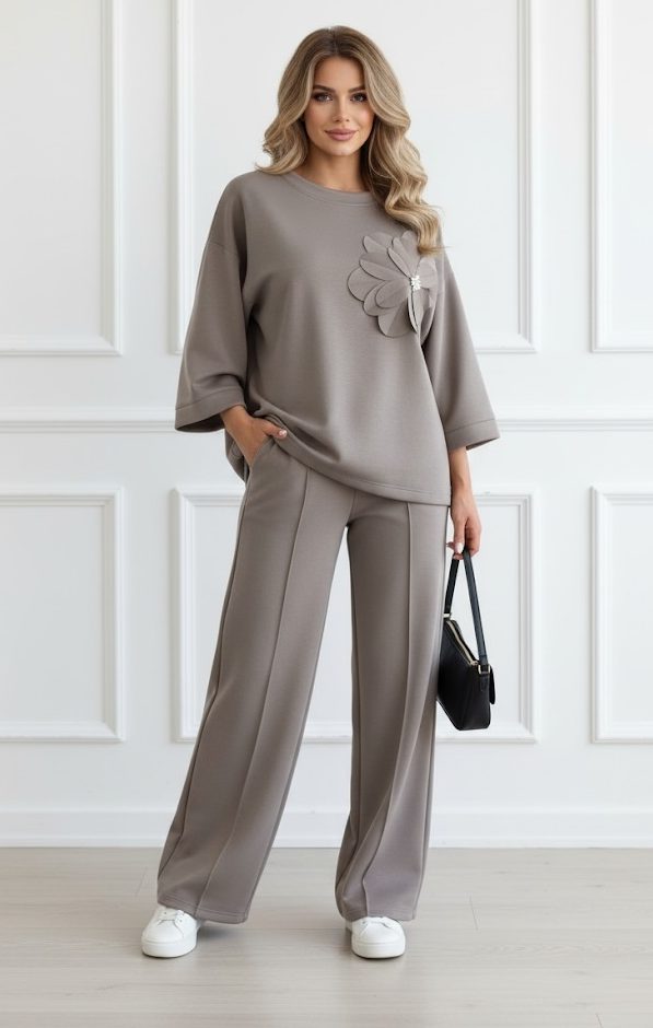 Compleu dama bej elegant cu floare 3D, alegerea perfecta pentru o aparitie ce imbina eleganta relaxata cu un detaliu unic. Bluza are un croi lejer si modern, cu maneci trei sferturi, iar piesa de rezistenta este floarea 3D aplicata, un element sofisticat care adauga un plus de feminitate si atrage toate privirile. Pantalonii cu croiala dreapta si talie inalta completeaza tinuta, alungind silueta si oferind confort exceptional si libertate de miscare pe tot parcursul zilei, fiind o alegere inspirata atat pentru o zi la birou, cat si pentru evenimente speciale, cine sau iesiri in oras. Materialul fluid si de calitate se aseaza placut pe corp, iar designul versatil iti permite sa accesorizezi outfitul cu pantofi stiletto pentru un look clasic sau cu adidasi albi pentru o abordare moderna si nonconformista. Este un compleu usor de adaptat, o piesa de rezistenta in garderoba oricarei femei care isi doreste sa iasa in evidenta printr-un stil rafinat, dar confortabil.