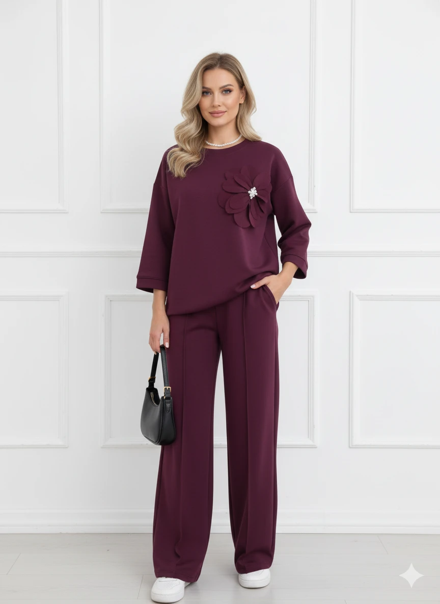 Compleu dama bordo elegant cu floare 3D, alegerea perfecta pentru o aparitie ce imbina eleganta relaxata cu un detaliu unic. Bluza are un croi lejer si modern, cu maneci trei sferturi, iar piesa de rezistenta este floarea 3D aplicata, un element sofisticat care adauga un plus de feminitate si atrage toate privirile. Pantalonii cu croiala dreapta si talie inalta completeaza tinuta, alungind silueta si oferind confort exceptional si libertate de miscare pe tot parcursul zilei. Nuanta intensa de bordo transmite rafinament si incredere, fiind o alegere inspirata atat pentru o zi la birou, cat si pentru evenimente speciale, cine sau iesiri in oras. Materialul fluid si de calitate se aseaza placut pe corp, iar designul versatil iti permite sa accesorizezi outfitul cu pantofi stiletto pentru un look clasic sau cu adidasi albi pentru o abordare moderna si nonconformista. Este un compleu usor de adaptat, o piesa de rezistenta in garderoba oricarei femei care isi doreste sa iasa in evidenta printr-un stil rafinat, dar confortabil.