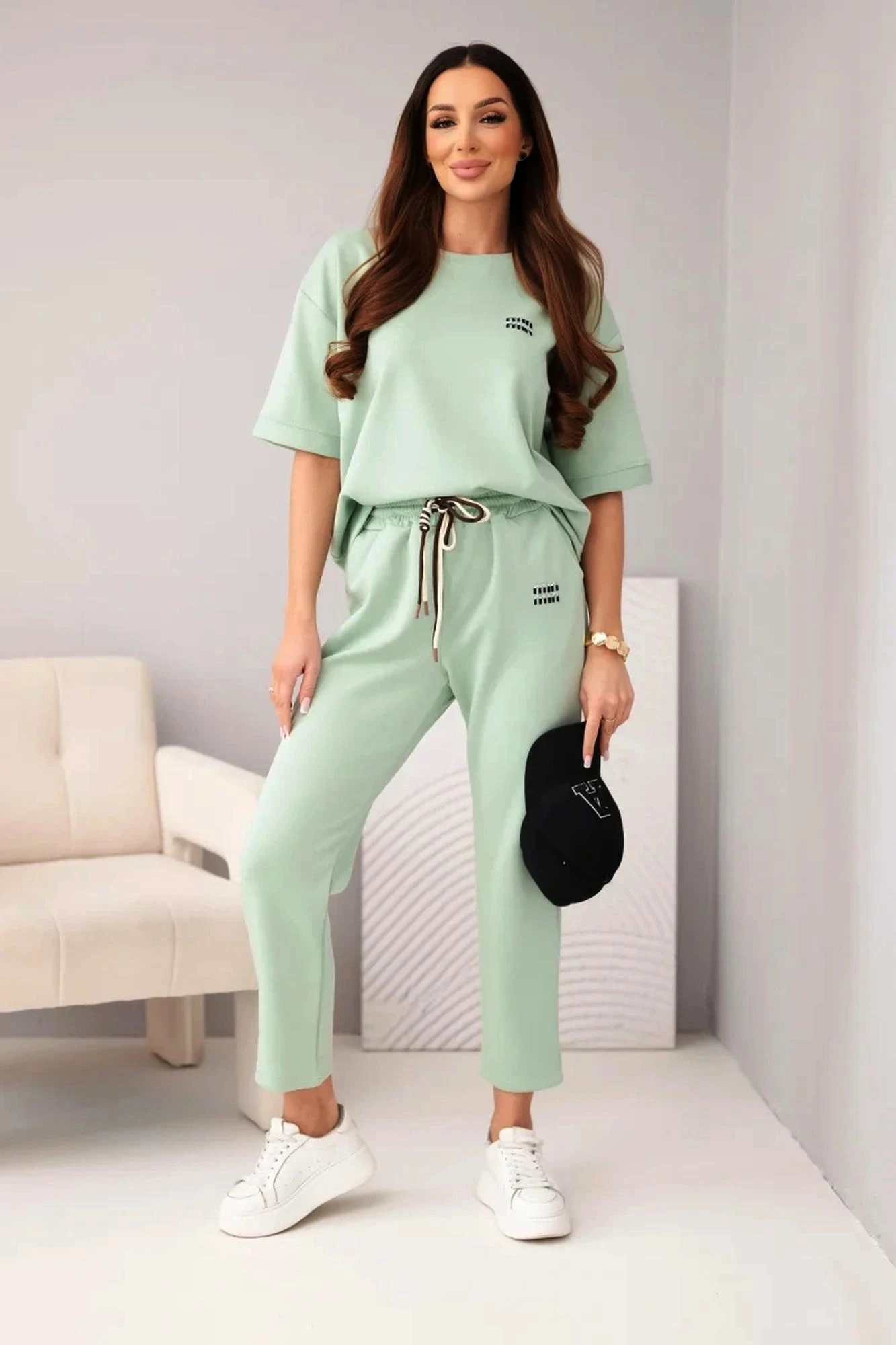 Compleu verde din vascoza cu top cu maneca scurta si pantaloni cu snur, alegerea perfecta pentru un look relaxat si modern in zilele de vara. Setul este format dintr-un top lejer cu maneci scurte si pantaloni lungi cu talie elastica, ajustabili prin snur contrastant. Detaliile grafice discrete si buzunarele practice fac din acest ansamblu alegerea ideala pentru plimbari sau activitati zilnice, oferind confort maxim fara a compromite stilul.
