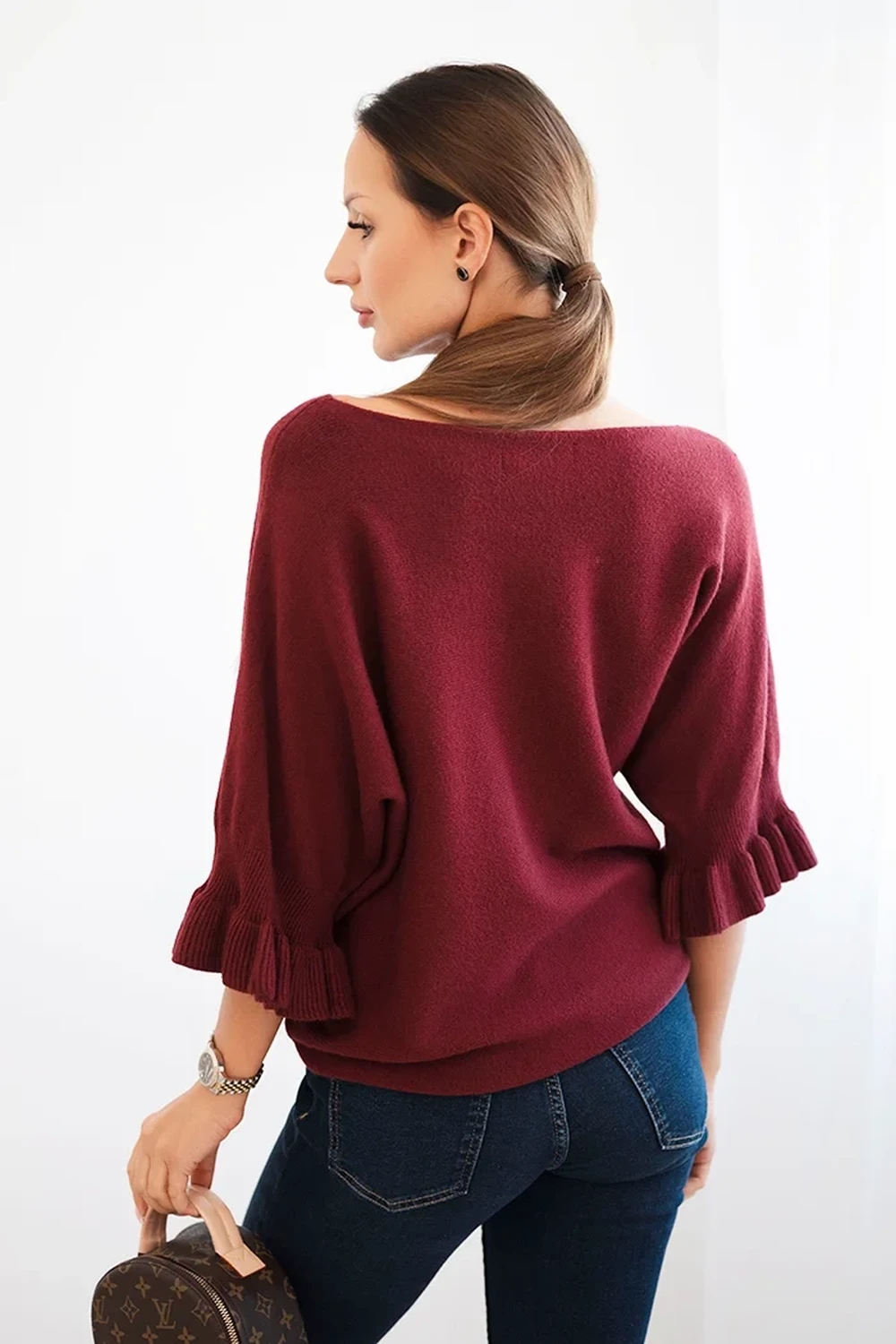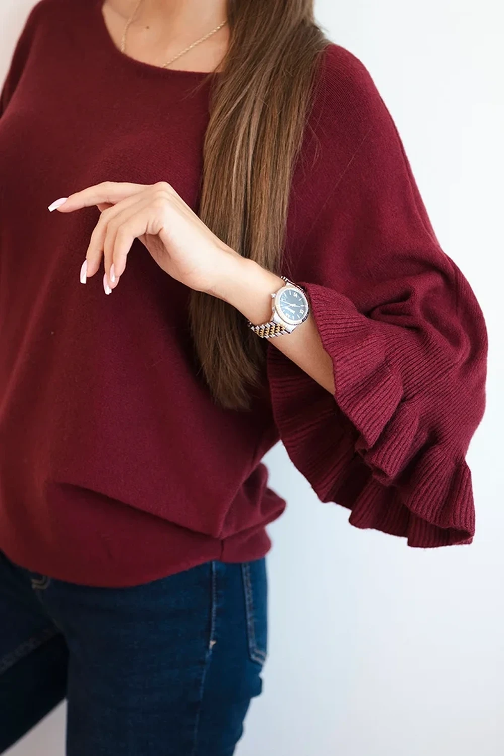 Pulover tricotat burgundy cu maneci bufante si volane, alegerea ideala pentru un look feminin si confortabil. Confectionat din material moale si placut la atingere, ofera libertate de miscare si un plus de stil in orice moment al zilei. Croiul lejer pune in valoare silueta, iar manecile bufante trei sferturi, accesorizate cu volane fine la mansete, aduc un detaliu elegant si modern. Se poate purta cu jeansi pentru un outfit casual sau cu fuste si pantaloni eleganti la birou. Versatil si usor de integrat in garderoba, acest pulover adauga un aer sofisticat tinutelor de zi cu zi.