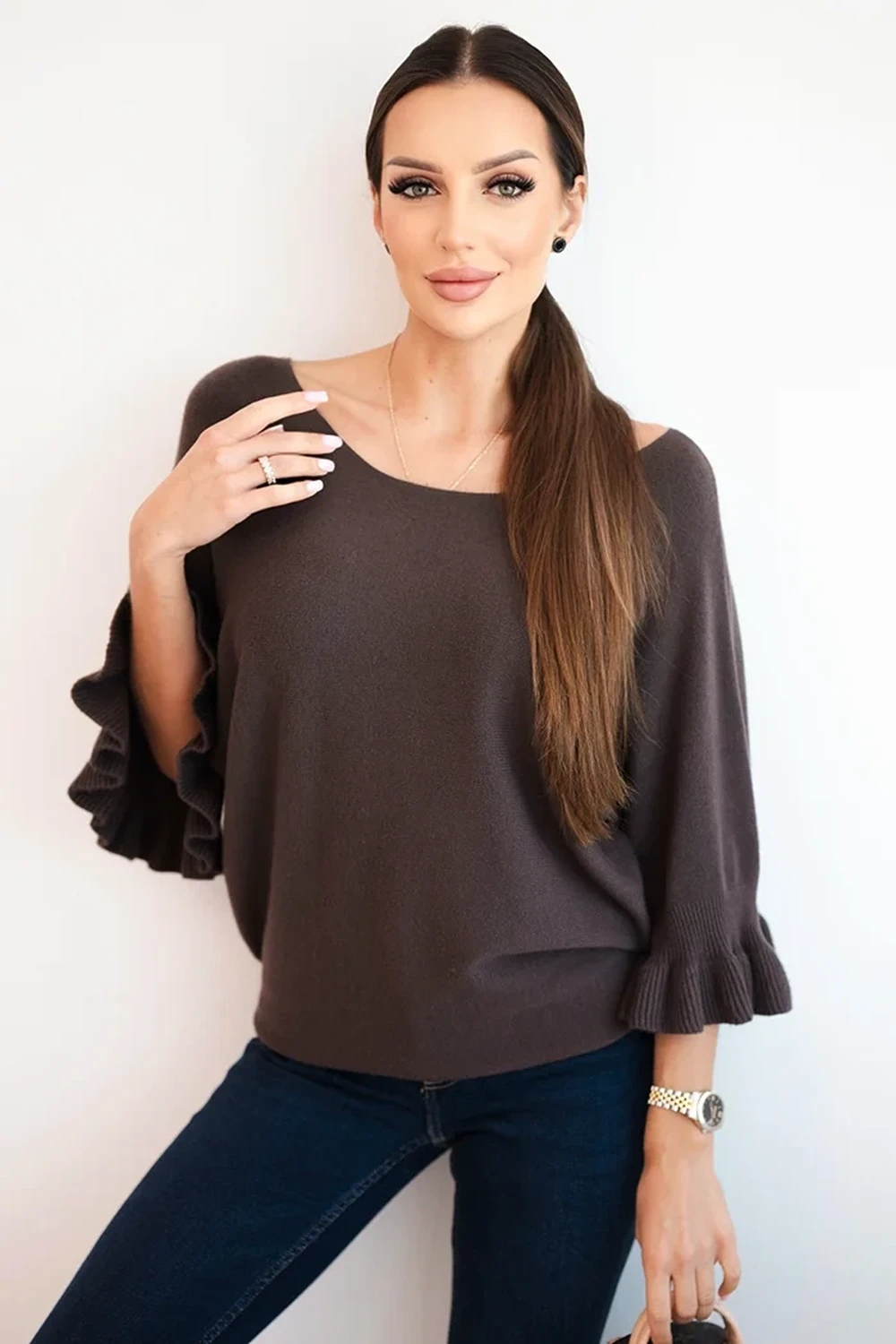 Pulover tricotat maro cu maneci bufante si volane, alegerea ideala pentru un look feminin si confortabil. Confectionat din material moale si placut la atingere, ofera libertate de miscare si un plus de stil in orice moment al zilei. Croiul lejer pune in valoare silueta, iar manecile bufante trei sferturi, accesorizate cu volane fine la mansete, aduc un detaliu elegant si modern. Se poate purta cu jeansi pentru un outfit casual sau cu fuste si pantaloni eleganti la birou. Versatil si usor de integrat in garderoba, acest pulover adauga un aer sofisticat tinutelor de zi cu zi.