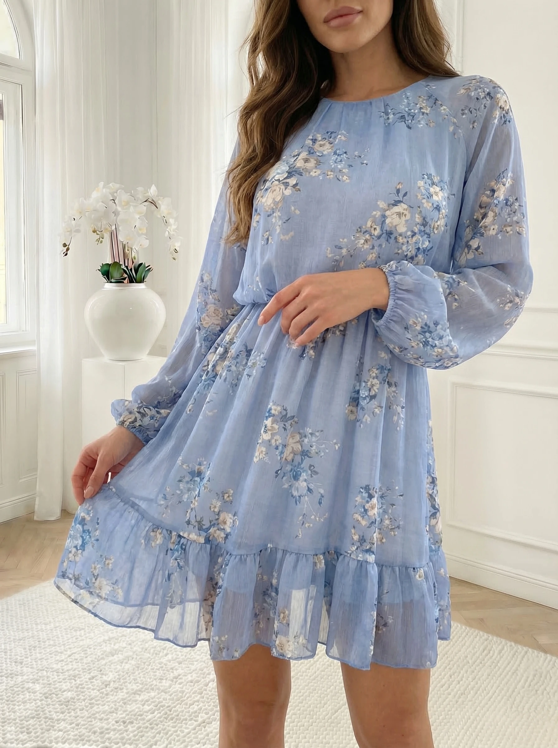 rochie-albastra-cu-volan-si-imprimeu-floral-romantic