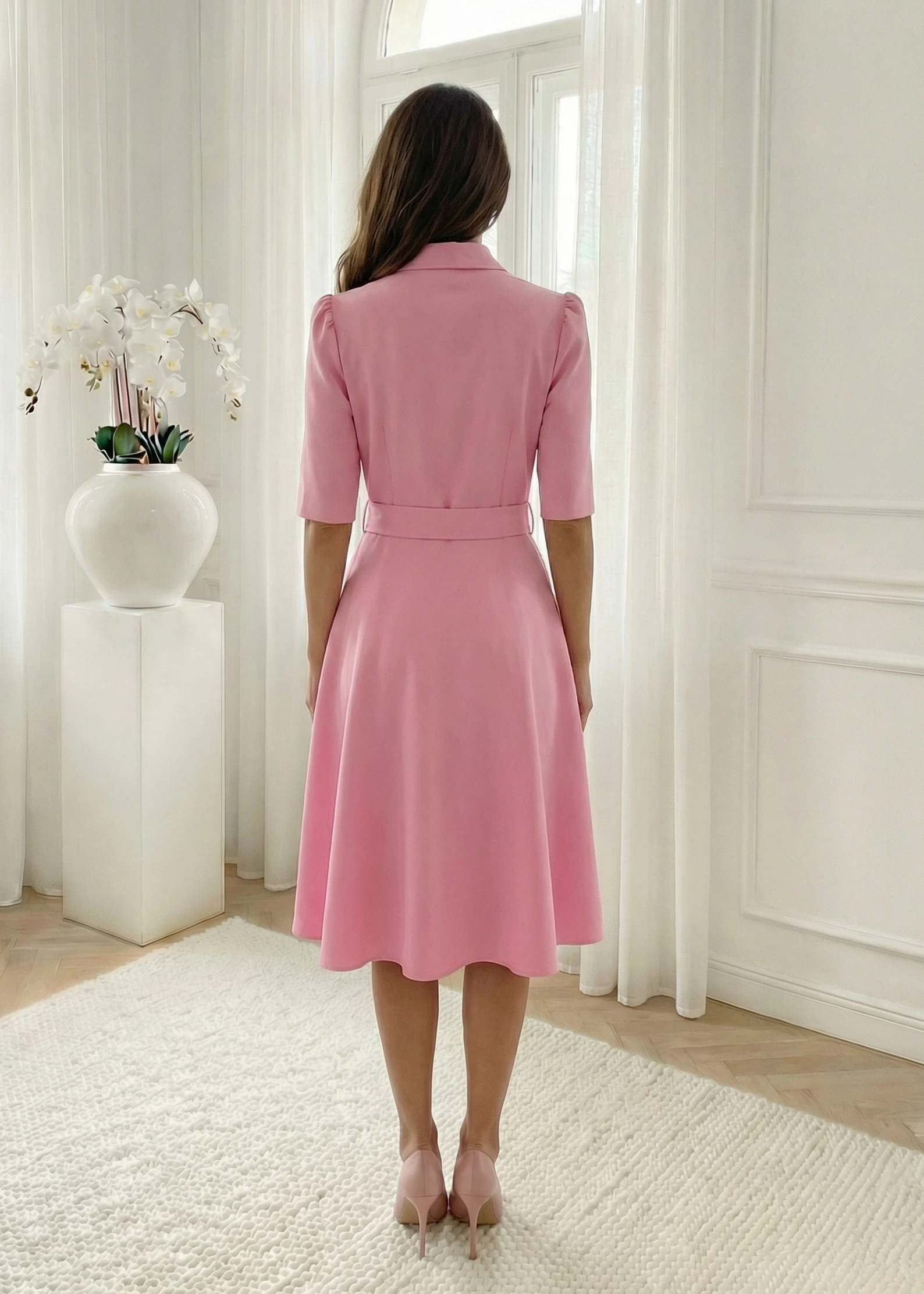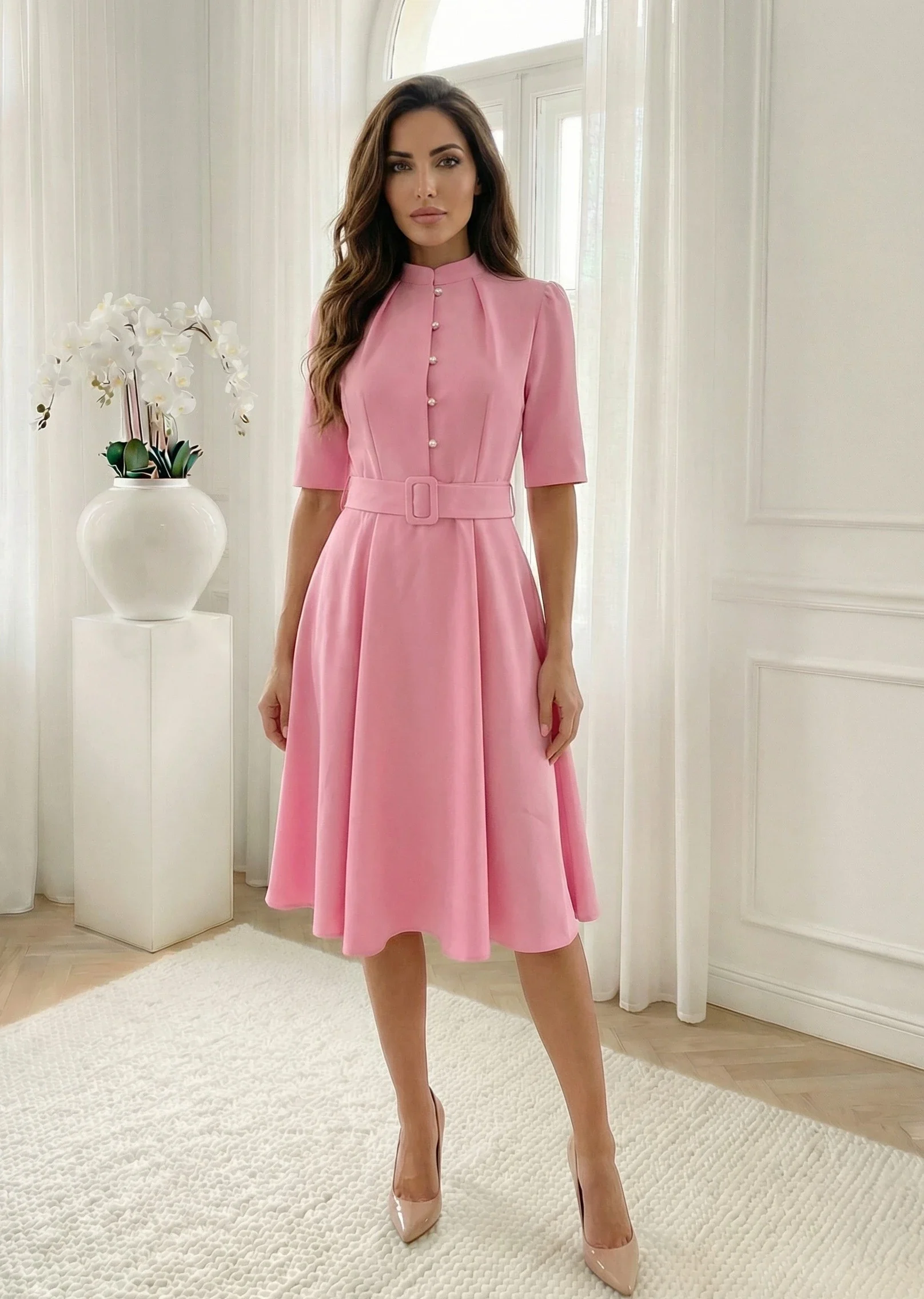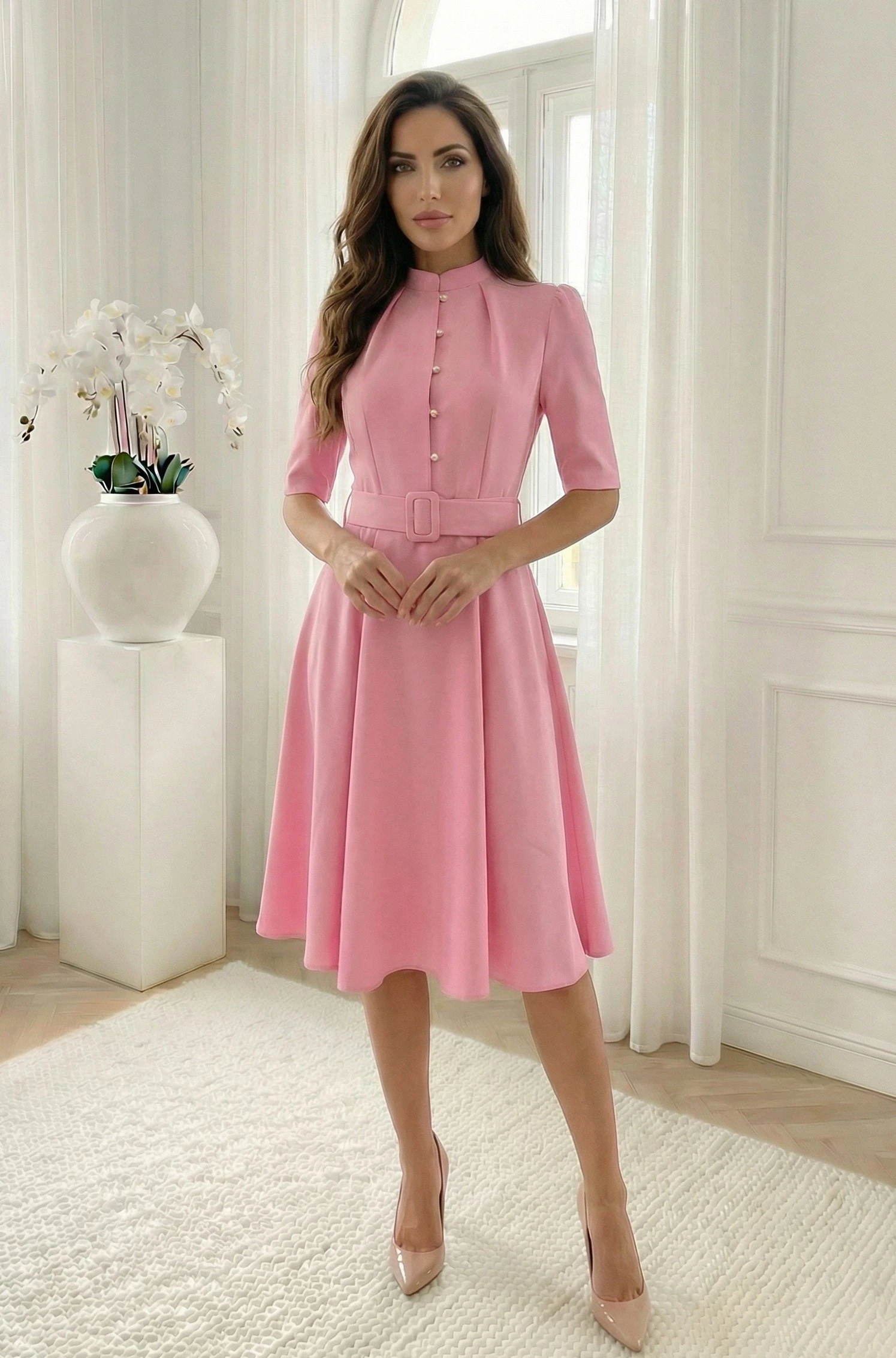 Rochie midi eleganta roz cu nasturi tip perla si curea, definitia feminitatii si a elegantei discrete, fiind alegerea perfecta pentru evenimente speciale de zi, botezuri sau tinute de birou rafinate. Piesa impresioneaza prin nuanta sa delicata si croiala impecabila care pune in evidenta silueta intr-un mod armonios. Partea superioara este decorata cu nasturi tip perla, oferind un detaliu pretios, in timp ce gulerul tunica si pliurile de la umeri adauga structura designului. Talia este frumos marcata de o curea lata in aceeasi culoare, ce face trecerea catre fusta fluida in croi clos. Materialul de calitate asigura confortul necesar si o tinuta impecabila pe tot parcursul purtarii, transformand aceasta rochie intr-o piesa esentiala pentru un look sofisticat.