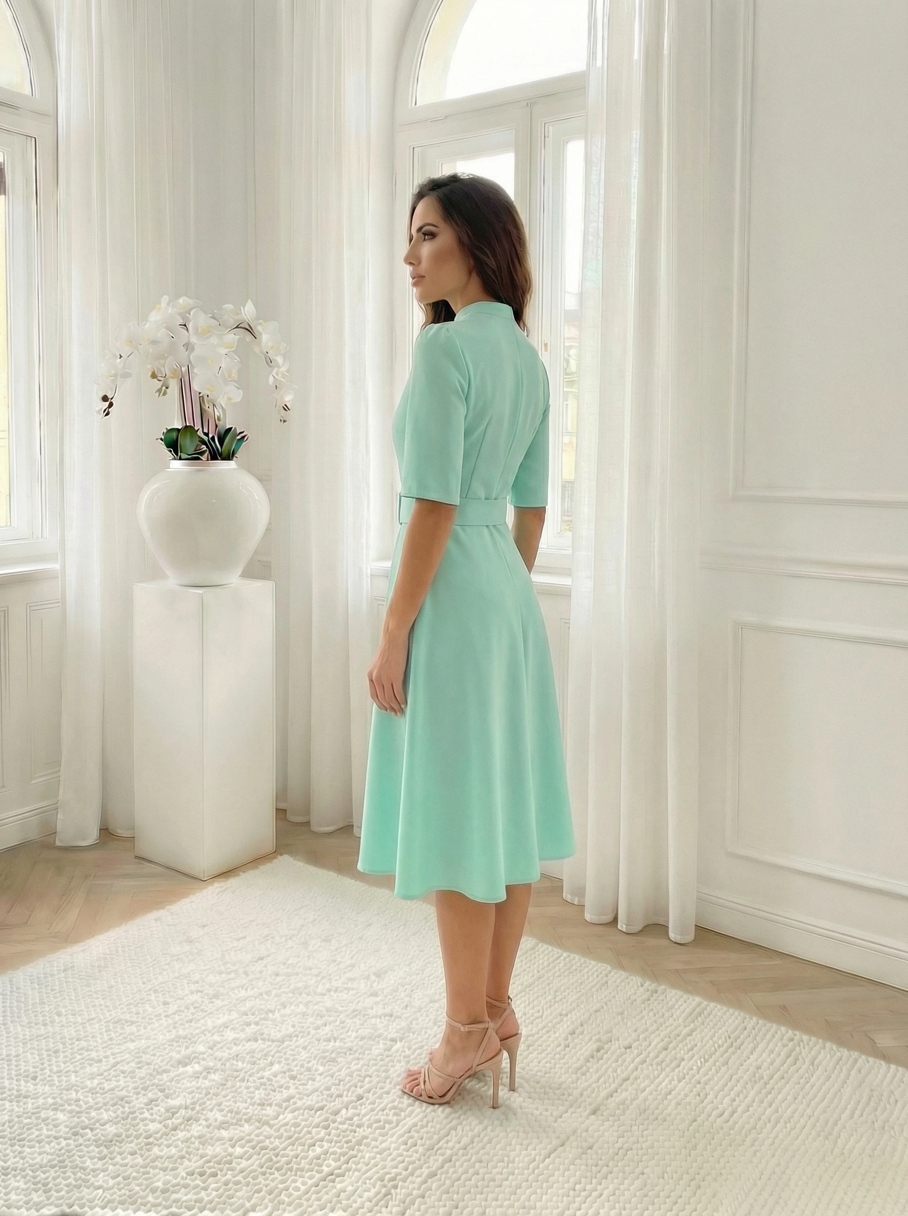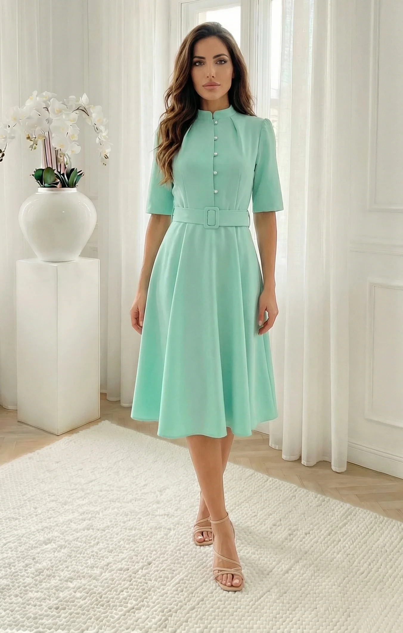 Rochie midi eleganta verde menta cu nasturi tip perla si curea, o alegere rafinata si proaspata, ideala pentru a adauga o nota de luminozitate si eleganta tinutelor tale pentru evenimente speciale sau aparitii la birou pline de stil. Piesa impresioneaza prin nuanta sa vibranta si croiala impecabila care pune in evidenta silueta intr-un mod feminin si discret. Partea superioara este decorata cu nasturi delicati ce imita perlele, oferind un contrast pretios si luminand designul. Gulerul tunica si pliurile discrete de la umeri adauga un plus de structura si sofisticare. Talia este frumos definita de o curea lata in aceeasi culoare, cu catarama imbracata, ce face trecerea catre fusta fluida in croi clos. Materialul de calitate asigura o tinuta impecabila si confortul necesar pe tot parcursul purtarii, transformand aceasta rochie turcoaz intr-o piesa esentiala si plina de stil pentru orice garderoba moderna.