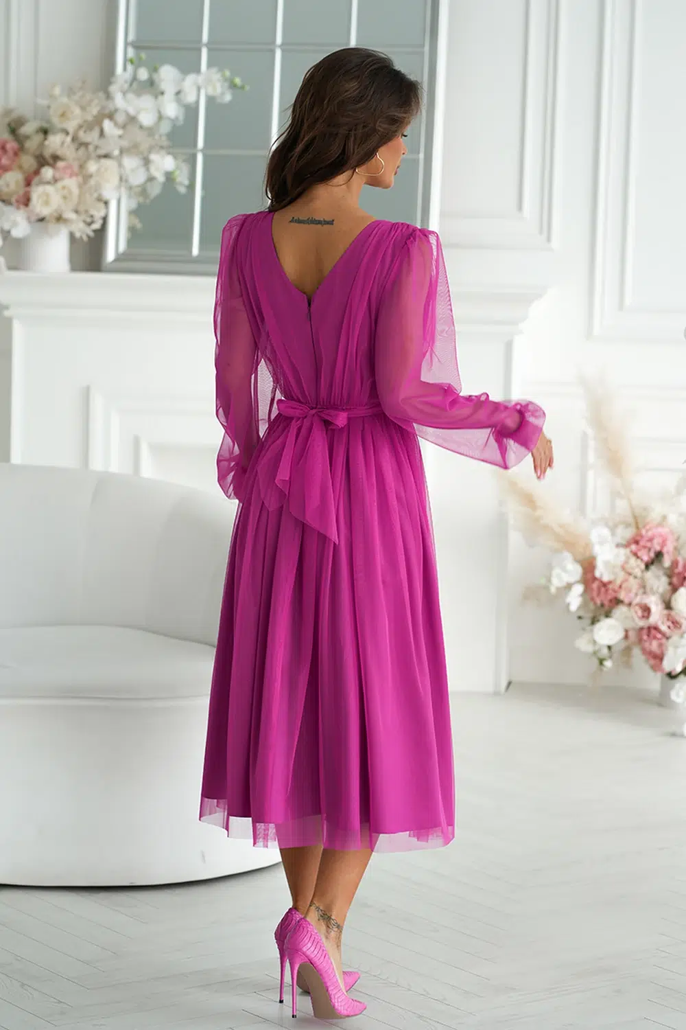 Rochie Paolina Dark Pink, eleganta din tul cu maneci transparente