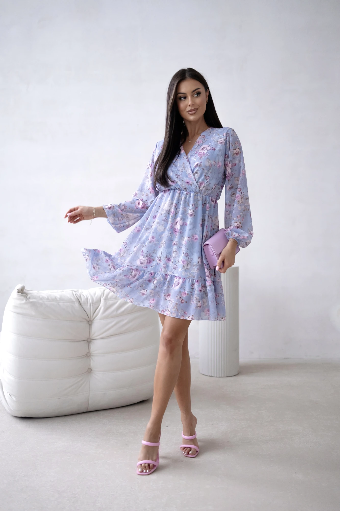 Rochie scurta bleu cu imprimeu floral si decolteu in V