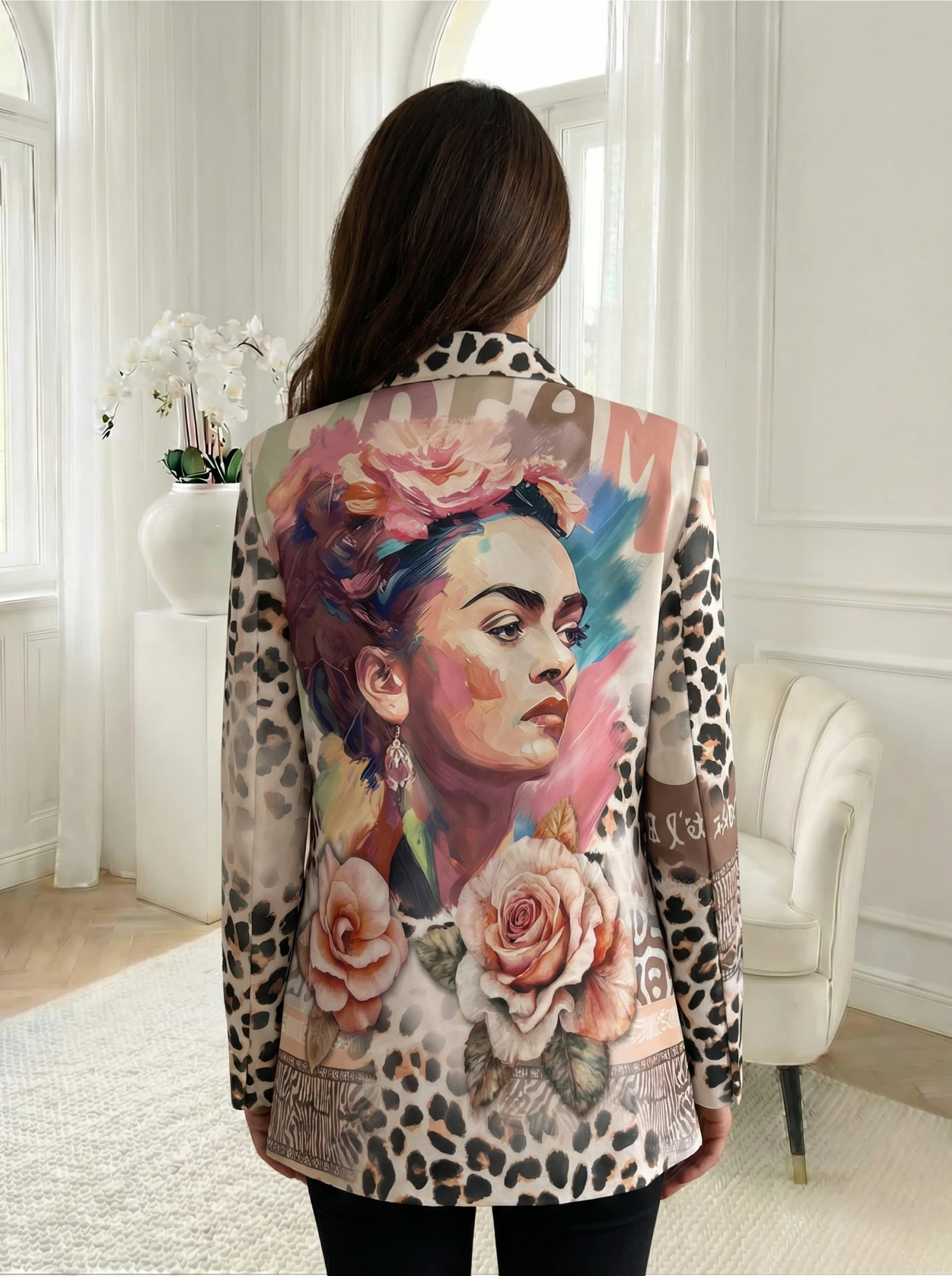 Sacou alb cu imprimeu leopard si portret artistic dream, o piesa vestimentara indrazneata si plina de expresivitate, creata special pentru a transforma orice tinuta intr-o declaratie de stil personal. Designul sau ecletic imbina petele clasice de leopard cu un portret feminin pictural, inconjurat de motive florale romantice in nuante de roz si piersica. Mesajul grafic dream plasat proeminent pe partea frontala si pe clapele buzunarelor adauga o nota moderna si optimista, in timp ce gulerul cu rever accentuat si croiala lejera ofera un echilibru perfect intre eleganta si confort. Detaliile grafice complexe de la baza si mixul de texturi vizuale fac din acest sacou un element central spectaculos, ideal pentru momentele in care vrei sa radiezi incredere si originalitate intr-un context urban sau la un eveniment relaxat.