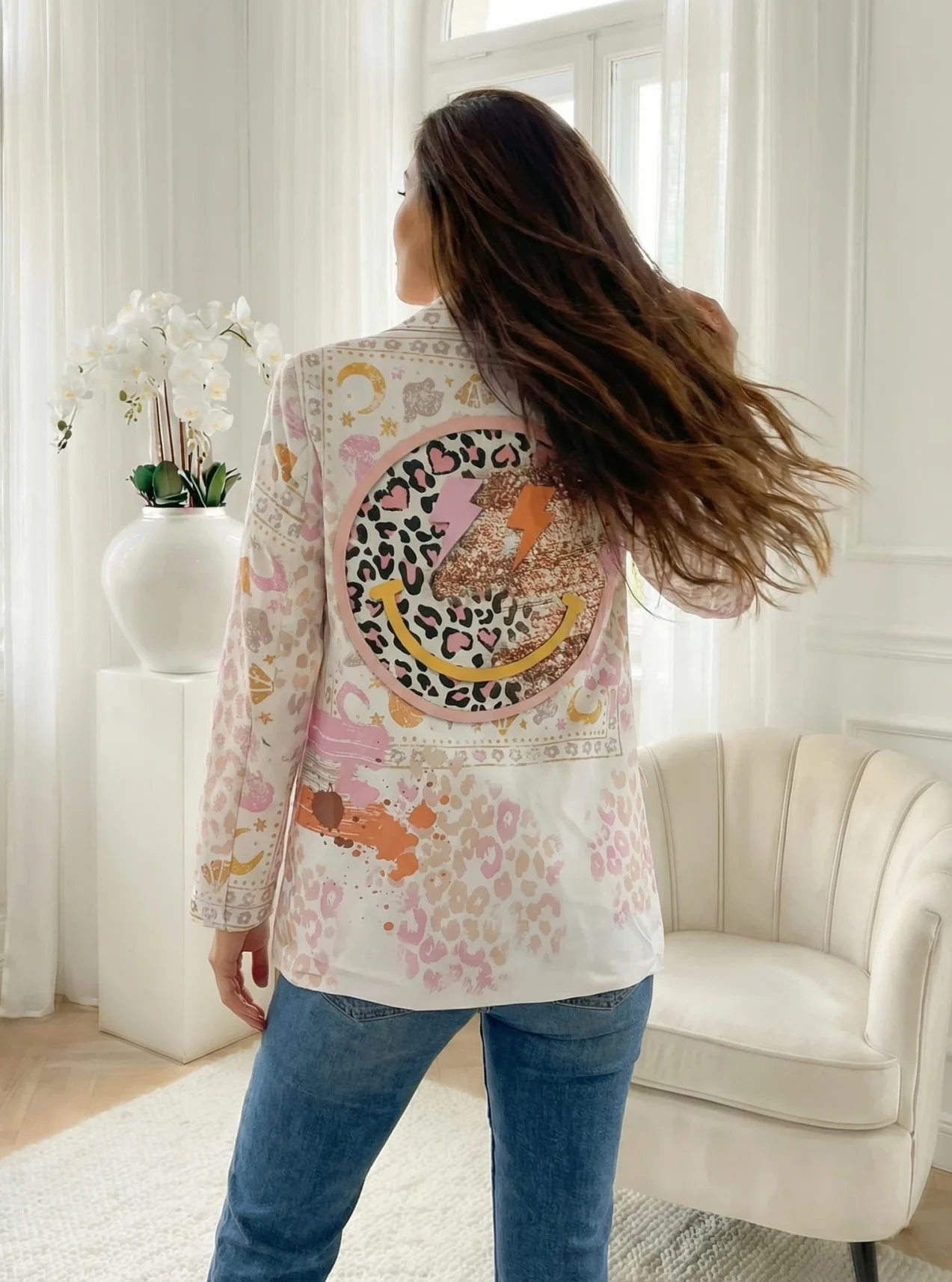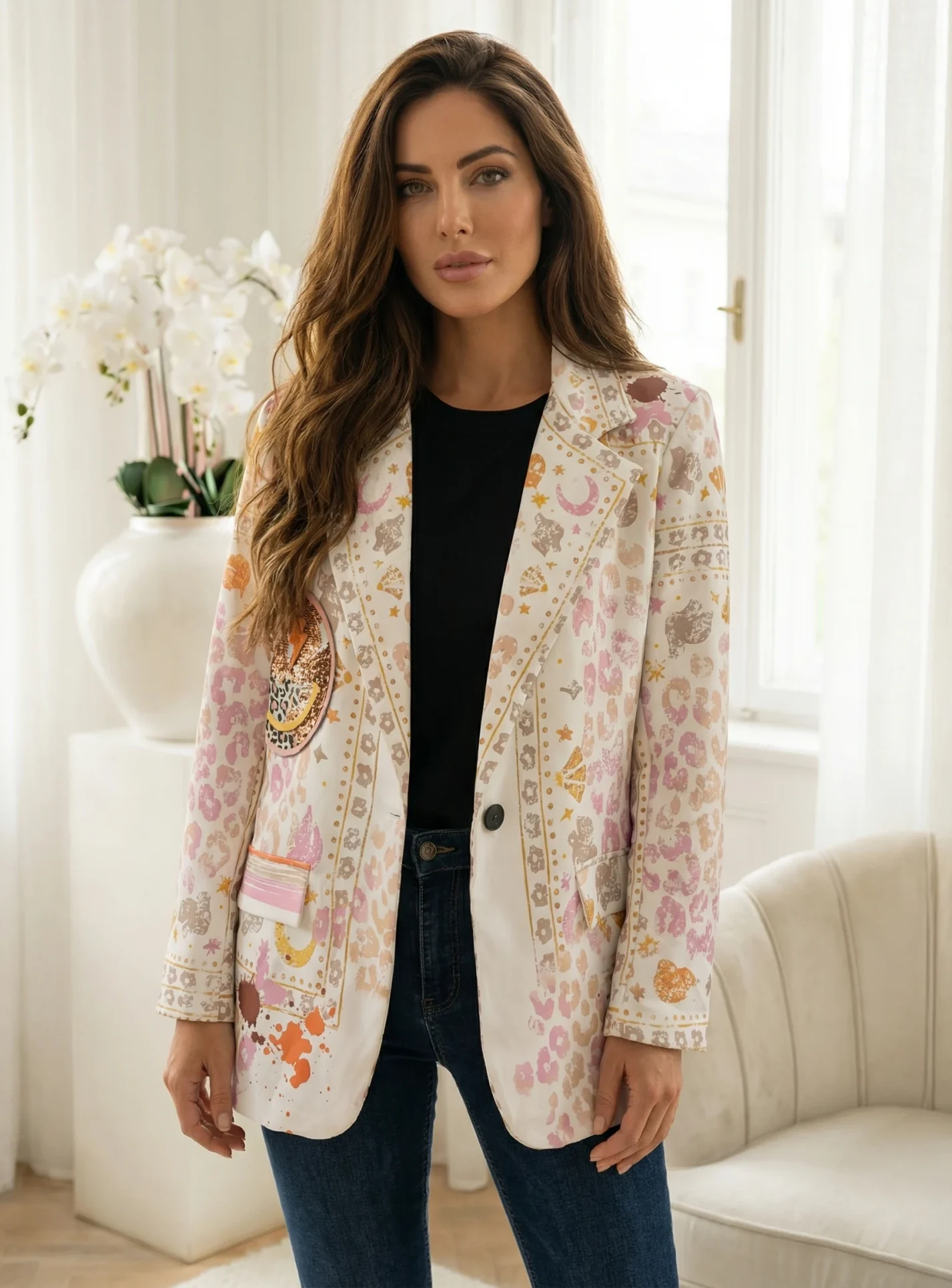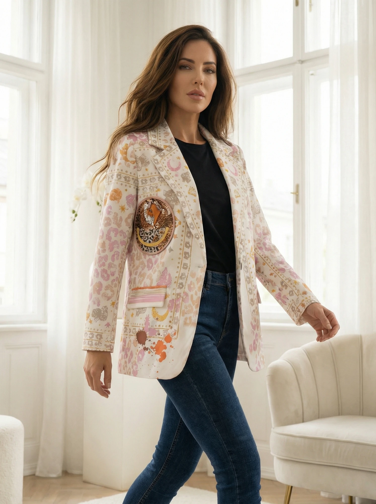 Sacou alb cu imprimeu multicolor si aplicatie frontala circulara, o piesa vestimentara statement care imbina armonios eleganta clasica a unui blazer cu detalii artistice moderne si jucause. Modelul se remarca prin imprimeul delicat in nuante pastelate de roz si auriu ce acopera intreaga suprafata, fiind imbogatit de o aplicatie circulara complexa pe partea frontala, realizata din paiete si texturi contrastante. Croiala lejera, dar bine structurata, este completata de revere clasice si un buzunar cu insertii colorate, oferind un look sofisticat si plin de personalitate. Realizat dintr-un material de calitate care pastreaza forma tinutei, acest sacou este ideal pentru a transforma o tinuta simpla cu jeansi sau pantaloni intr-o aparitie memorabila, fiind perfect pentru evenimente de zi sau iesiri in care doresti sa iesi in evidenta prin stil si originalitate.