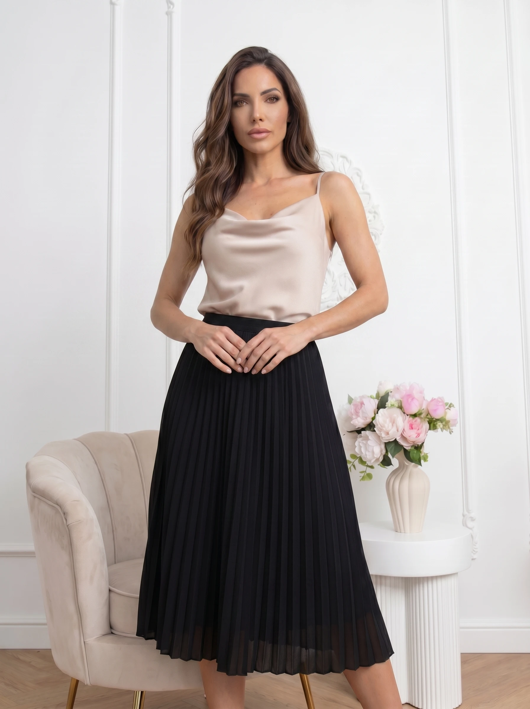 Top satinat bej cu decolteu drapat, dintr-un materialul fluid cade armonios pe silueta, oferind atat confort, cat si un aspect rafinat. Decolteul drapat generos ofera un aer senzual si modern, transformand aceasta piesa intr-o alegere perfecta pentru evenimente speciale de zi sau iesiri in oras, putand fi asortat cu usurinta cu pantaloni si fuste.