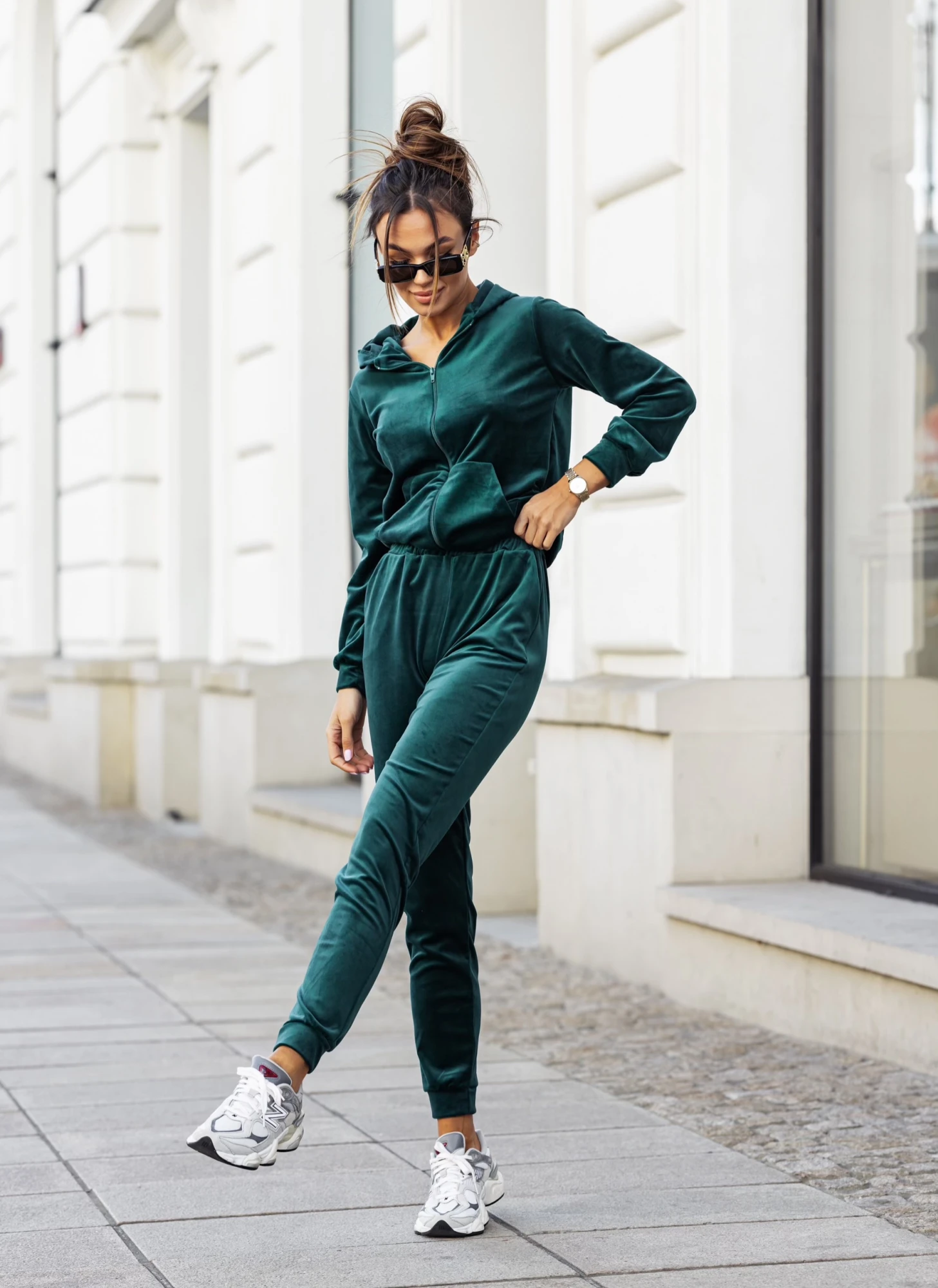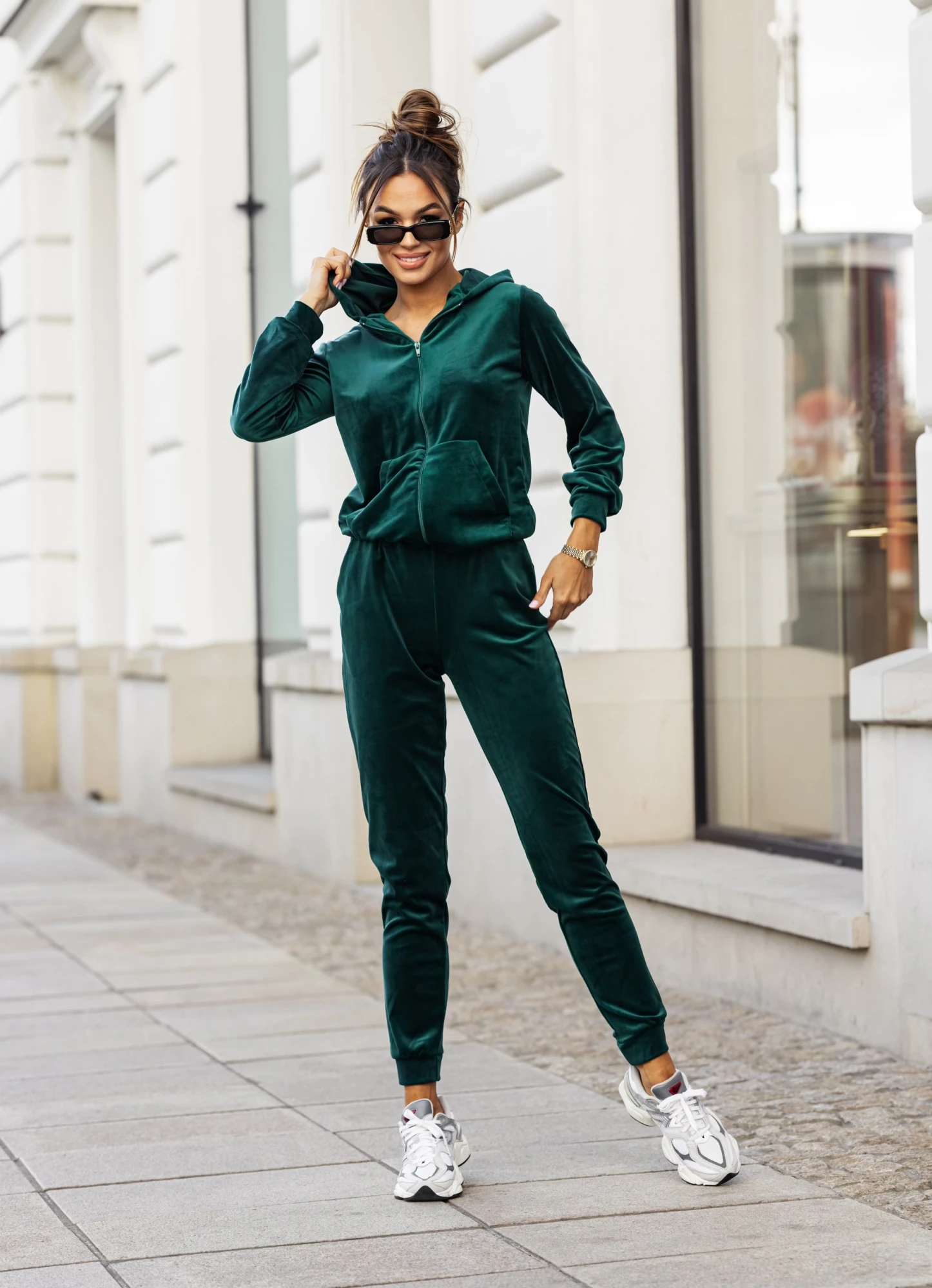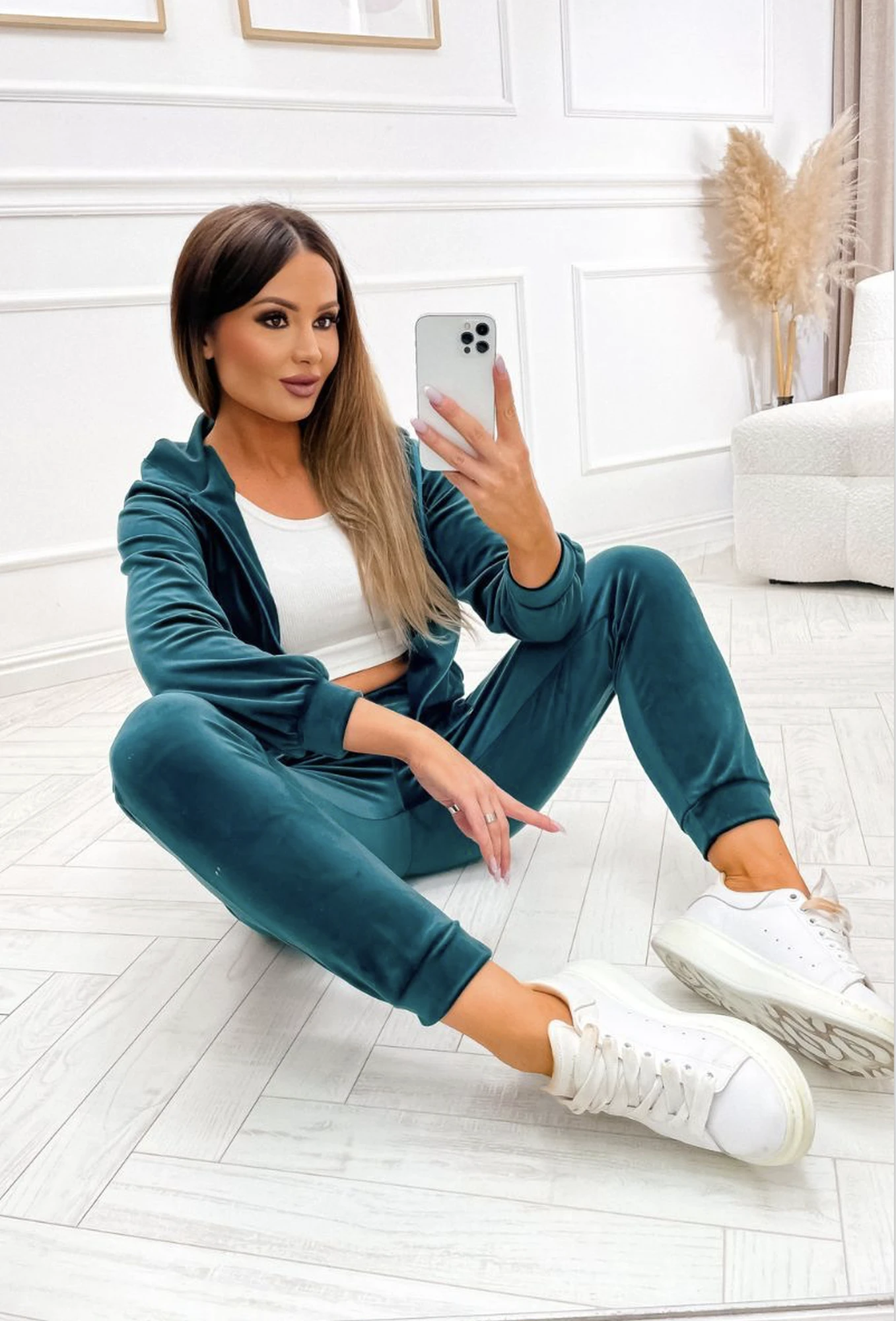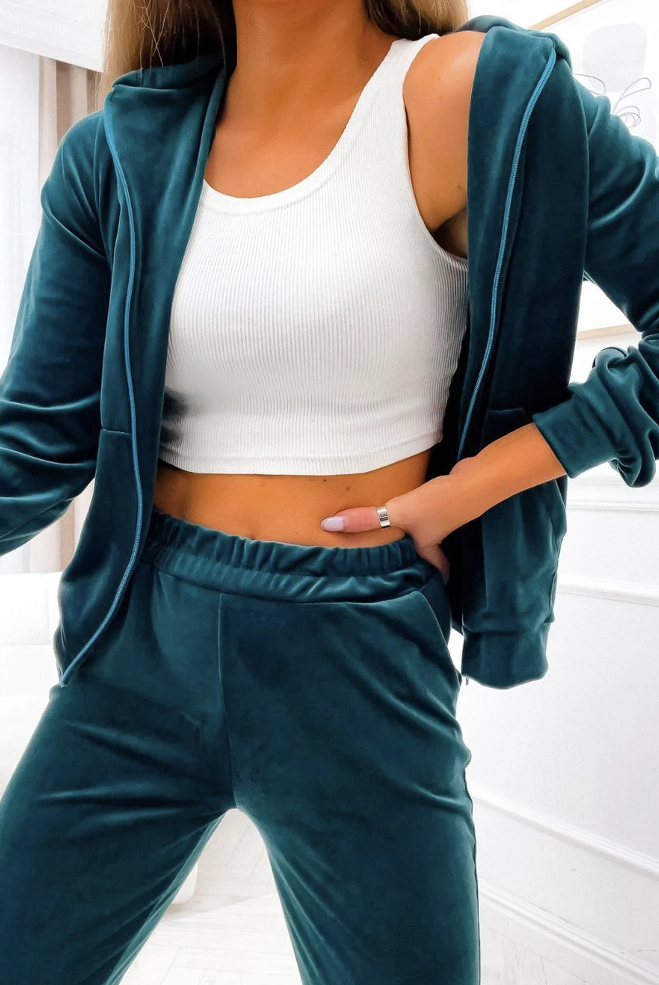 Trening verde din catifea cu fermoar, piesa ideala pentru femeile care apreciaza atat confortul, cat si eleganta casual. Confectionat dintr-un material moale si elastic, setul este format din bluza cu fermoar si gluga practica, perfecta pentru tinute de zi sau athleisure. Pantalonii cu talie elastica si croi conic asigura libertate de miscare si un fit relaxat, potrivit pentru activitatile zilnice. Nuanta vibranta de verde confera prospetime si originalitate, transformand acest trening intr-o alegere must-have pentru garderoba de sezon. Poate fi purtat cu sneakers pentru un look modern si fresh.