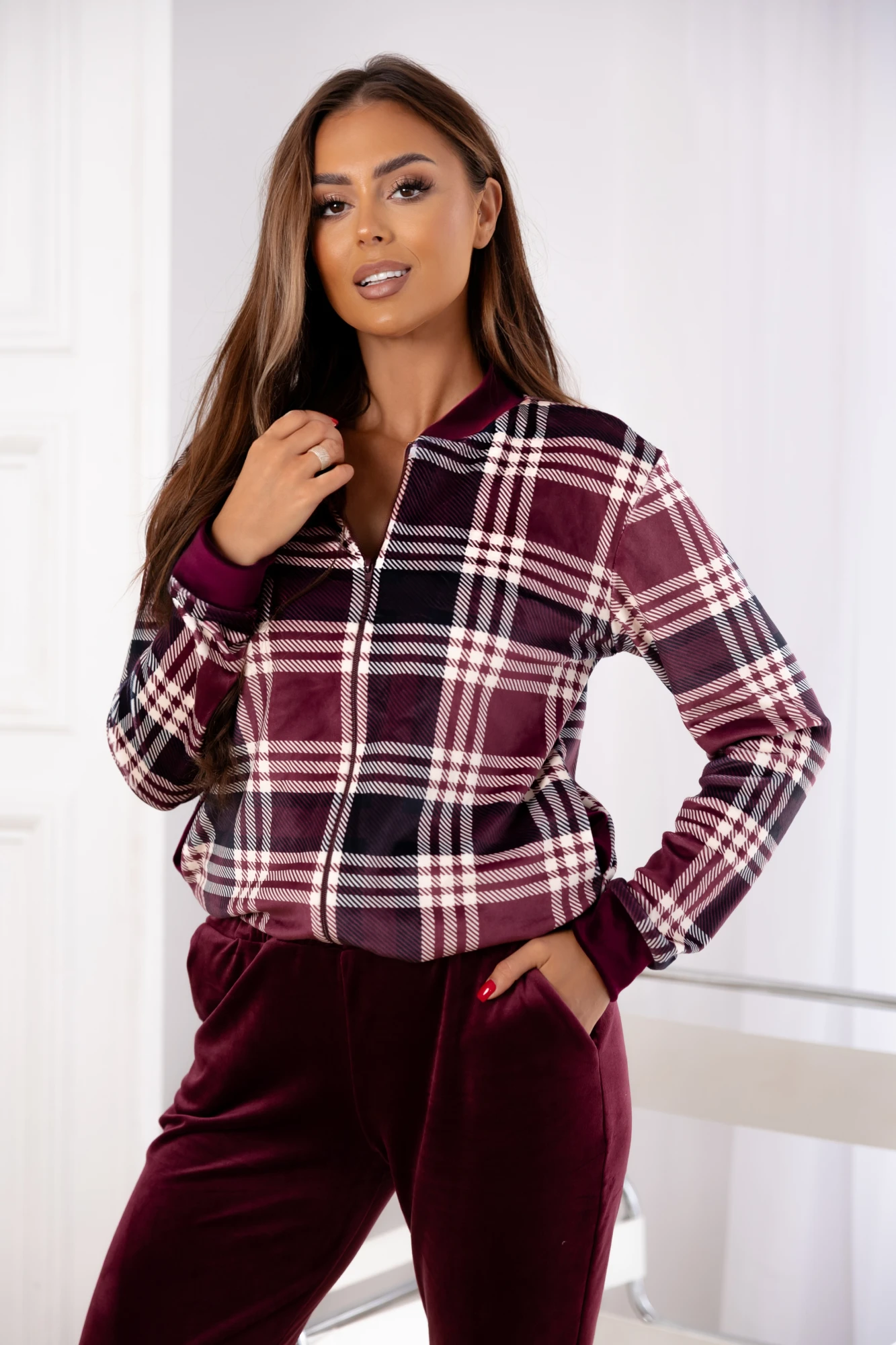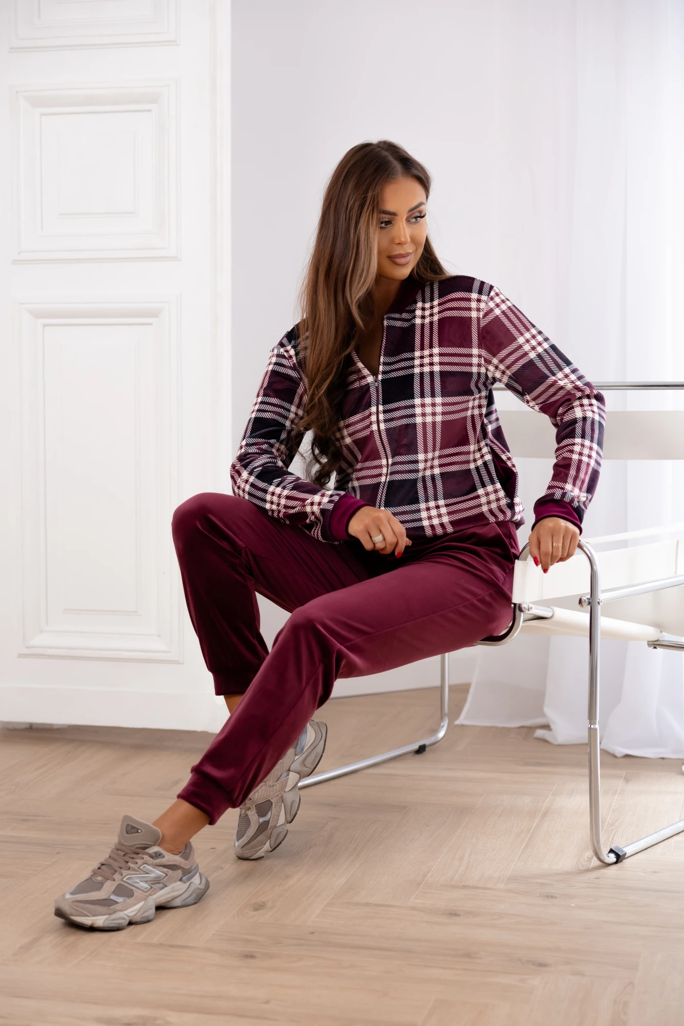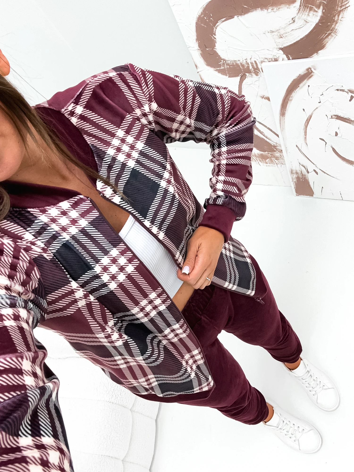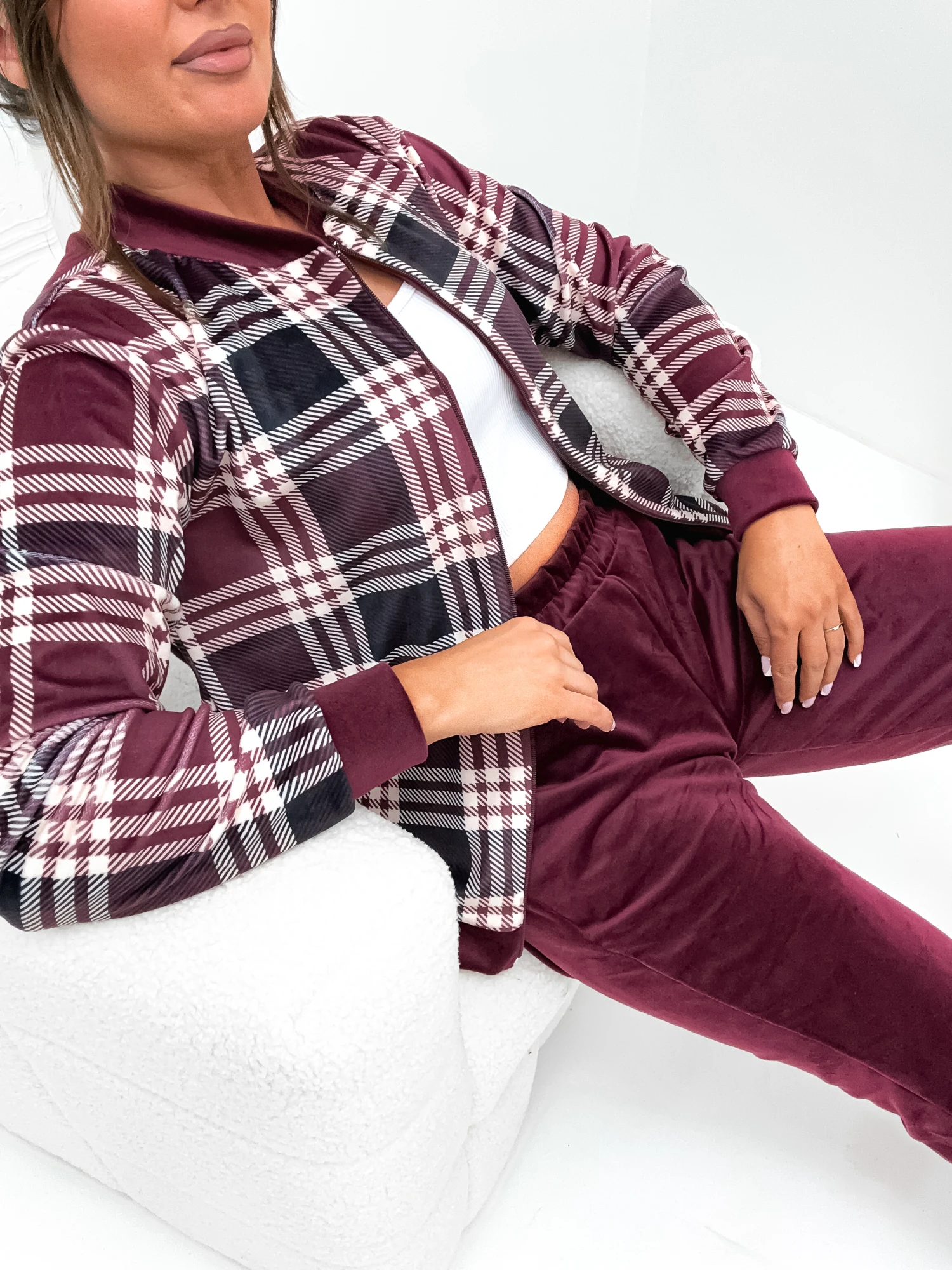 Trening visiniu catifelat cu jacheta in carouri si pantaloni conici, reat pentru tinute moderne si confortabile. Jacheta are imprimeu in carouri in nuante de visiniu, alb si negru, cu fermoar frontal si mansete elastice, oferind un aspect casual chic. Pantalonii sunt realizati din material catifelat, cu croi conic si talie elastica, asigurand libertate de miscare si un plus de lejeritate. Textura fina a materialului adauga un aer sofisticat, in timp ce designul versatil permite purtarea atat in tinute sport casual, cat si la iesiri relaxate. Poate fi combinat usor cu sneakers sau pantofi sport, pentru un look fresh si actual. Este alegerea ideala pentru femeile care apreciaza confortul si stilul intr-o singura piesa vestimentara.
