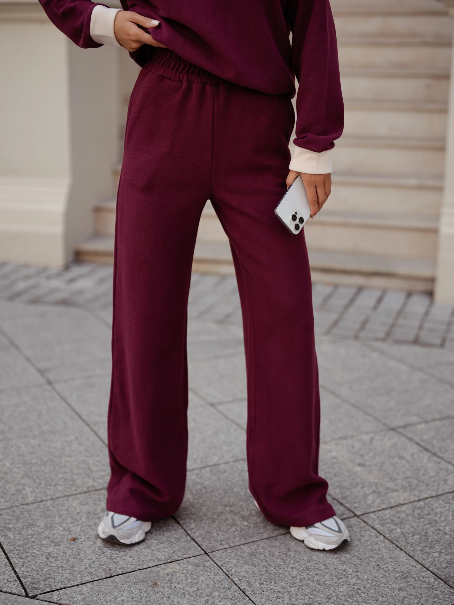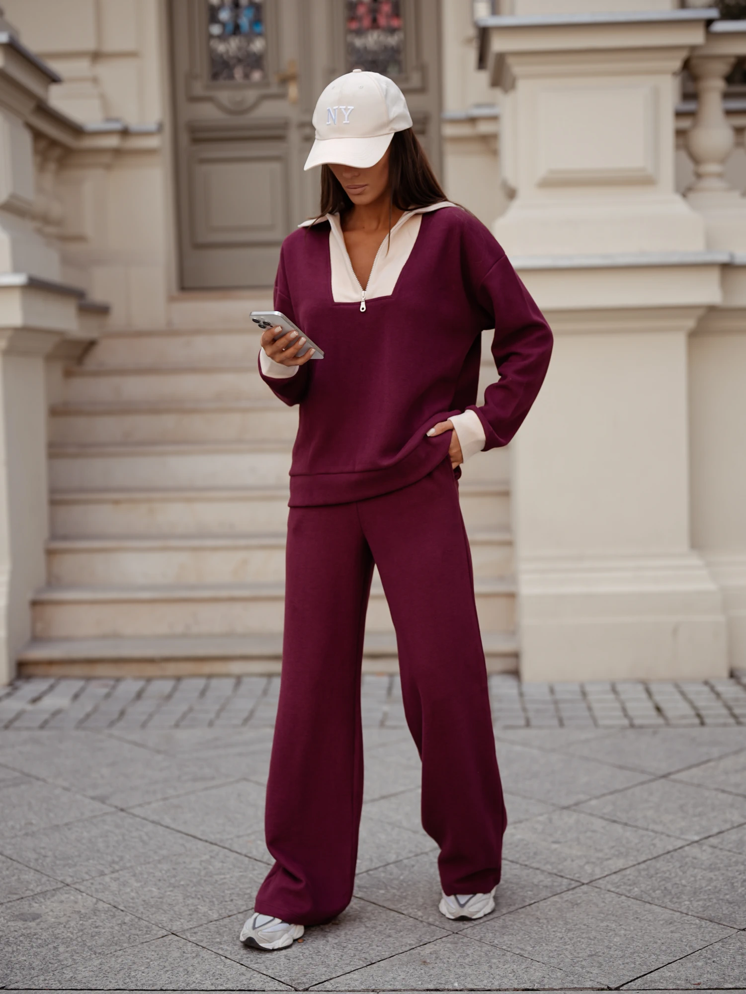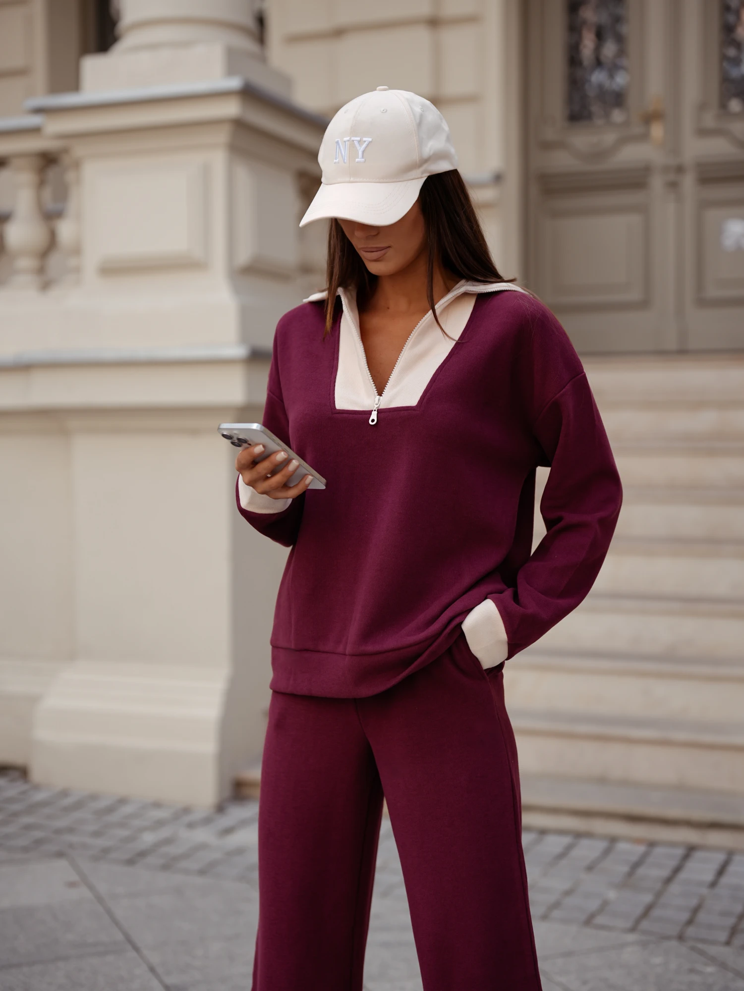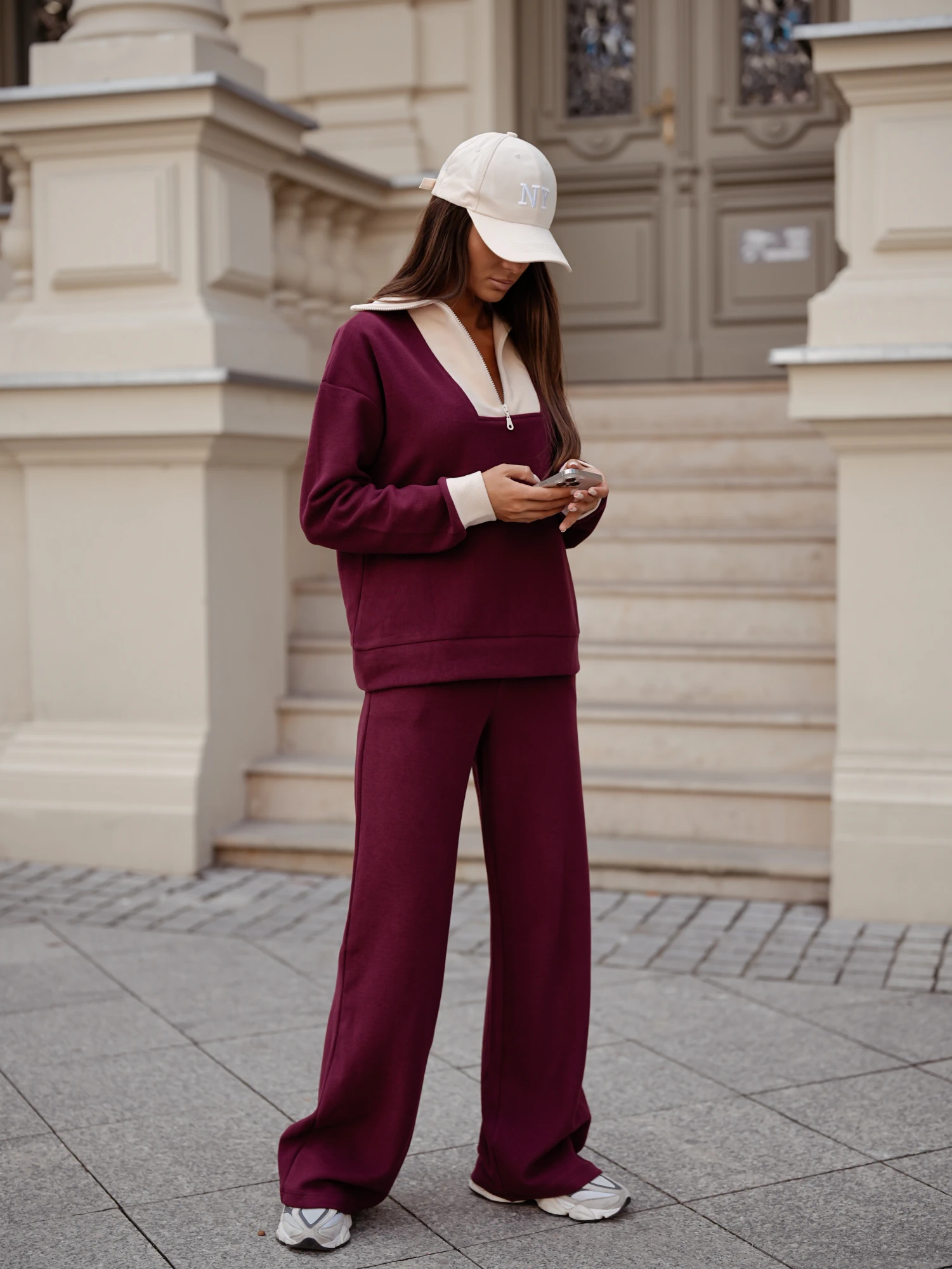 Trening visiniu din bumbac cu fermoar scurt si detalii crem, care imbina perfect confortul cu stilul urban. Bluza are un design modern, cu decolteu in V si fermoar scurt care permite ajustarea dupa preferinte, completata de mansete lejere si un contrast placut in nuanta crem. Pantalonii largi cu talie elastica ofera libertate de miscare si o silueta relaxata, ideala pentru tinutele casual sau iesirile de zi cu zi. Realizat dintr-un material moale si placut la atingere, acest set este alegerea ideala pentru un look relaxat, dar stylish, potrivit atat pentru plimbari, cat si pentru calatorii. Poarta-l cu sneakers si o sapca pentru un outfit complet si modern.