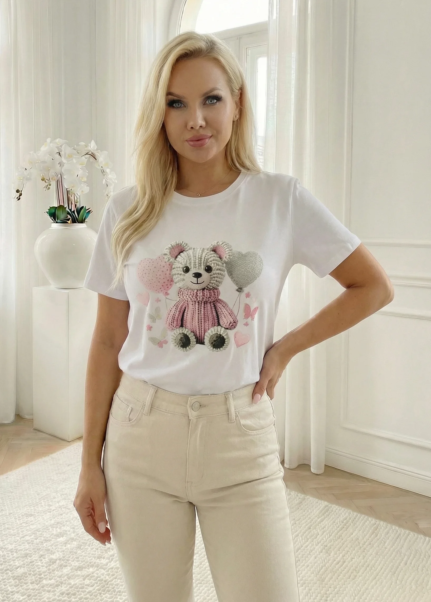 Tricou alb din bumbac cu ursulet si inimioare, perfect pentru tinute casual si feminine. Modelul este realizat din material confortabil, placut la purtare, ideal pentru utilizare zilnica. Imprimeul cu ursulet, inimioare si detalii delicate adauga un plus de stil si originalitate. Se asorteaza usor cu pantaloni, jeansi sau fuste, fiind o piesa versatila in garderoba ta.
