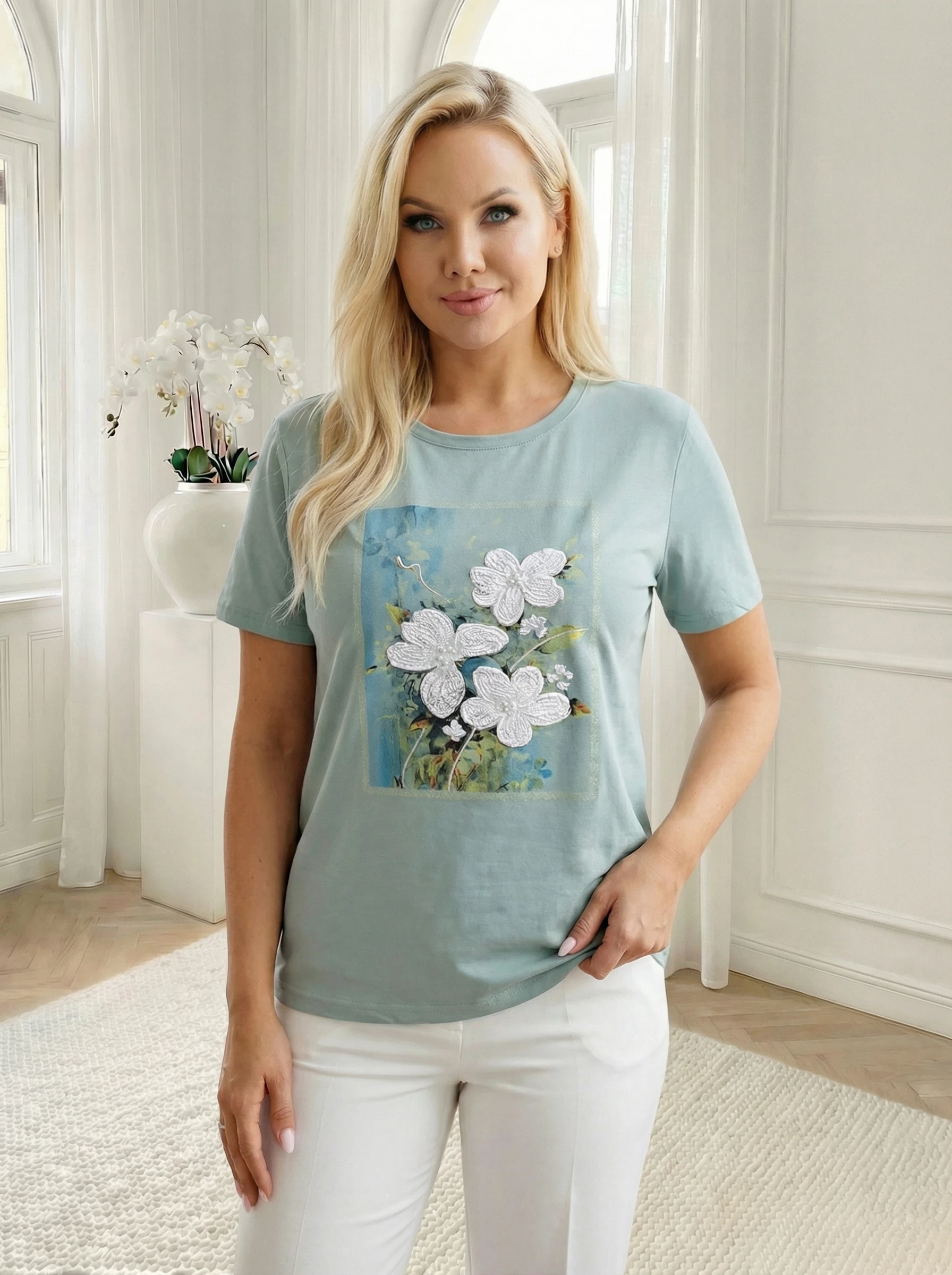 Tricou din bumbac verde menta cu print artistic in relief, ideal pentru a aduce o nota de prospetime si originalitate garderobei tale de zi cu zi. Piesa centrala a designului este imprimeul sub forma de tablou abstract, peste care sunt pictate flori albe, delicate. Aceasta suprapunere de texturi transforma un tricou clasic intr-o piesa feminina si sofisticata, fiind alegerea ideala pentru a fi purtat cu pantaloni albi office sau jeansi.