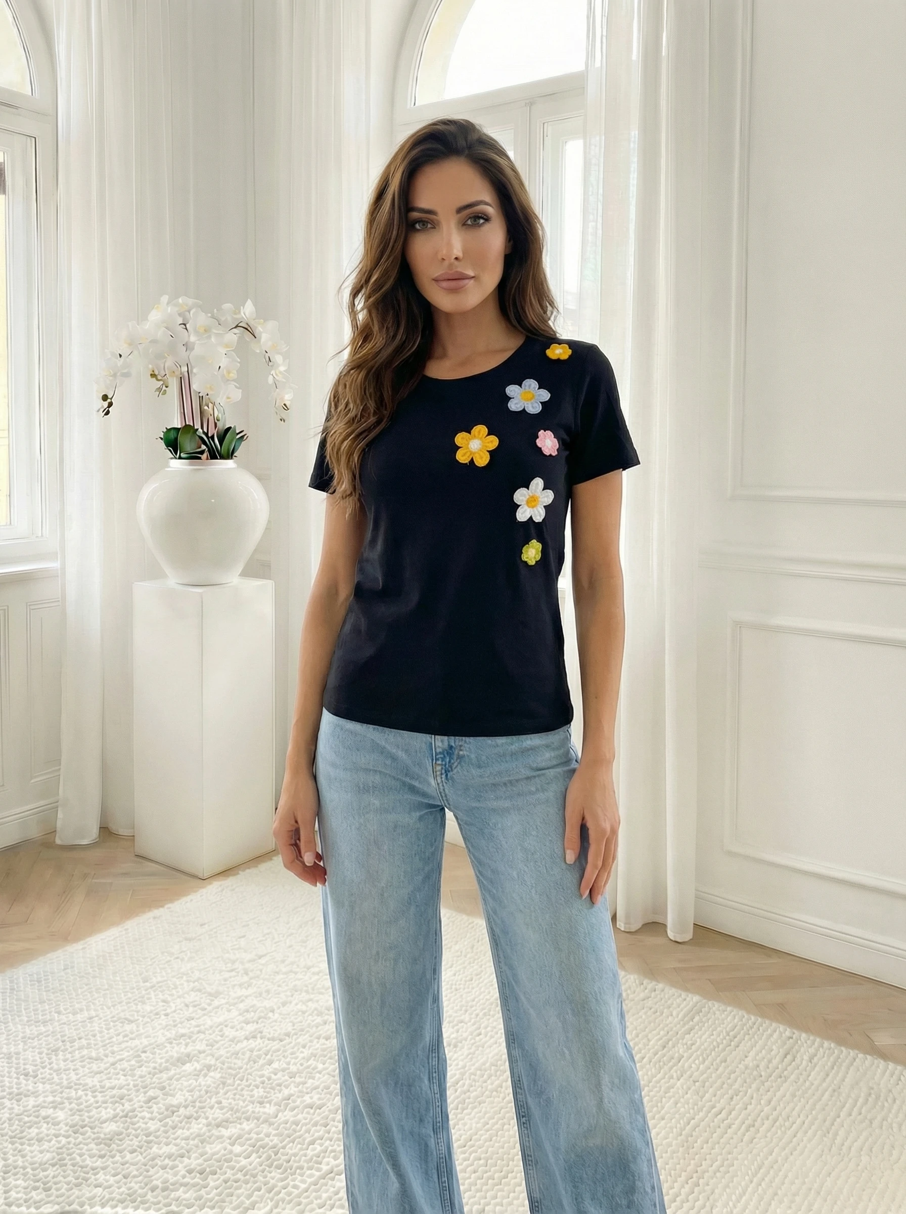 Tricou negru cu flori brodate, perfect pentru un look casual modern. Realizat din bumbac confortabil, usor elastic, ofera libertate de miscare si un fit lejer, ideal pentru purtare zilnica. Designul minimalist este completat de detalii florale delicate, care transforma acest tricou intr-o piesa versatila, usor de integrat in orice garderoba. Se potriveste perfect cu blugi, pantaloni casual sau fuste, pentru tinute relaxate sau smart casual.