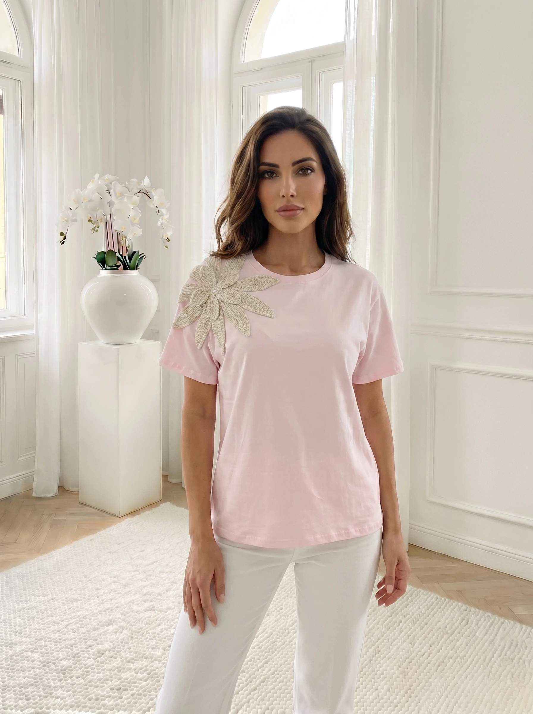 Tricou roz din bumbac cu aplicatie floare crosetata, alegerea perfecta pentru a adauga o nota de originalitate tinutelor tale casual. Piesa se remarca prin aplicatia spectaculoasa a unei flori crosetate pe umar, decorata in centru cu o perla delicata. Realizat din bumbac moale, tricoul este usor de asortat cu pantaloni albi sau jeansi, fiind alegerea ideala pentru un look fresh.
